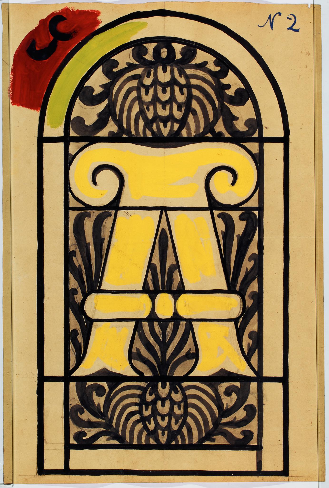 Ce carton est le modèle couleur précis à l’échelle 1:1 du petit vitrail illustrant la deuxième des dix lettres composant les mots latins “panis vivus” (pain vivant) situé au-dessus des trois fenêtres du choeur de l’église Saints-Pierre-et-Paul à Villars-sur-Glâne. Aujourd’hui l’ensemble des ces dix petits vitraux a été déposé pour laisser place à des fenêtres à bornes.