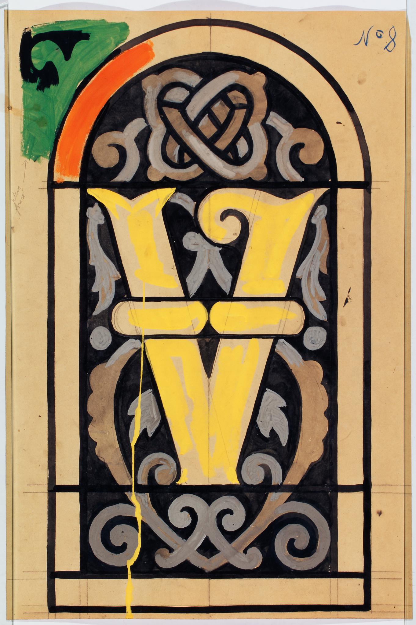 Ce carton est le modèle couleur précis à l’échelle 1:1 du petit vitrail illustrant la huitième des dix lettres composant les mots latins “panis vivus” (pain vivant) situé au-dessus des trois fenêtres du choeur de l’église Saints-Pierre-et-Paul à Villars-sur-Glâne. Aujourd’hui l’ensemble des ces dix petits vitraux a été déposé pour laisser place à des fenêtres à bornes.