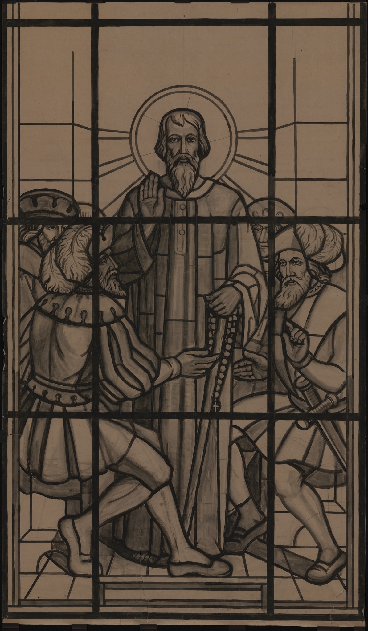 Carton pour une verrière représentant saint Nicolas de Flüe lors de l'épisode de la Diète de Stans. Le saint, vêtu d’une robe de bure et tenant un chapelet, la tête entourée d'un nimbe dont jaillissent des rayons, lève la main droite pour ramener la paix entre les représentants des cantons en pleine dispute.