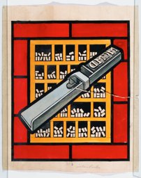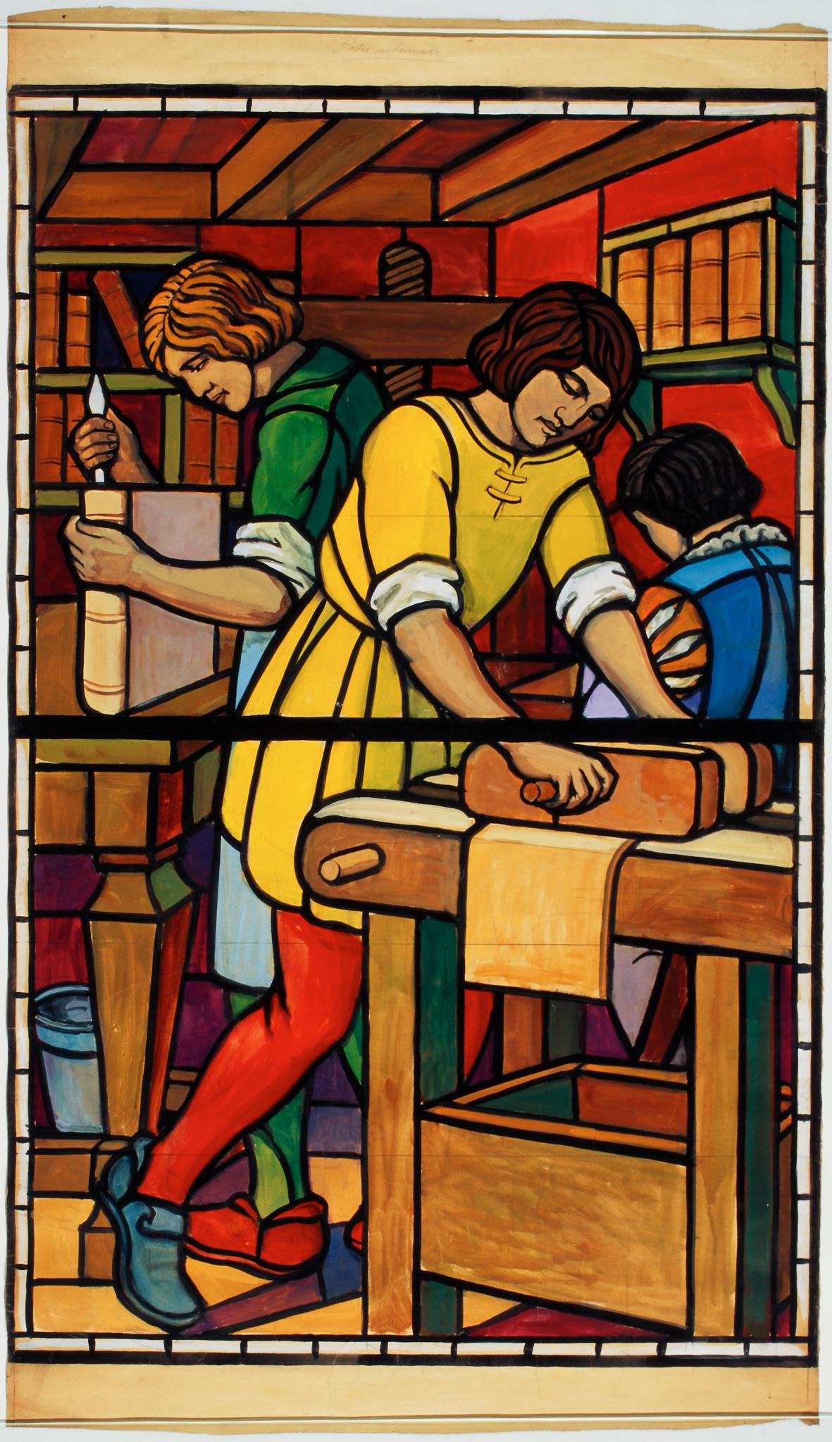 Ce carton en couleur est le modèle précis à l’échelle 1:1 de la partie centrale du vitrail consacré à un atelier d’imprimerie situé au premier étage et ornant la grand baie vitrée de la cage d’escalier menant aux ateliers et bureaux de l’imprimerie Saint-Paul à Fribourg. Cet édifice, sis au no. 40, a été ajouté à la première partie (no. 38) construite par les architectes Broillet & Wulffleff en 1902-1903 (Lauper, 2012, p. 73).
