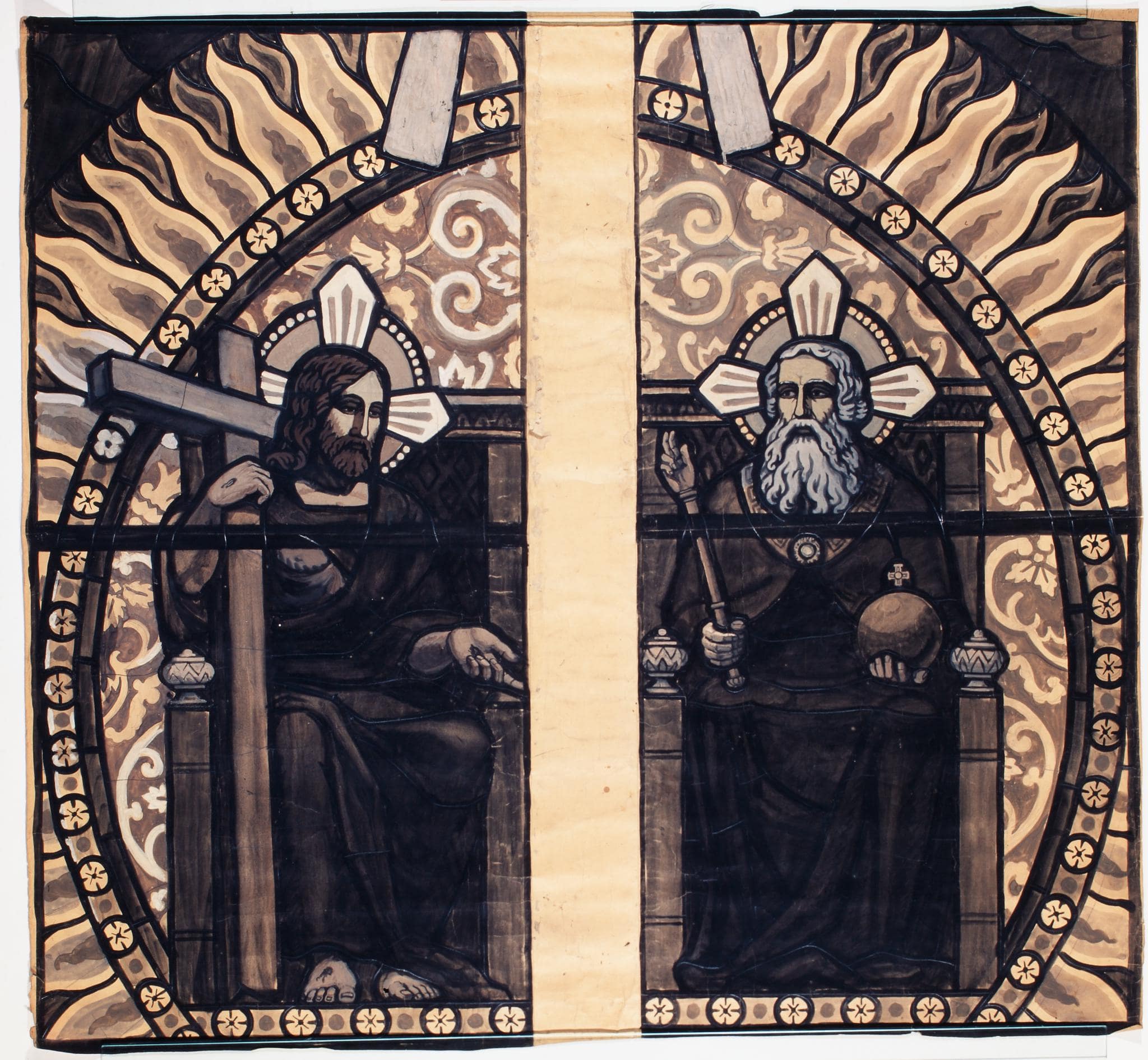 Ce carton en noir et blanc est le modèle précis à l’échelle 1:1 pour le quatrième registre (Christ et Dieu) du vitrail consacré aux Romontois et leurs protecteurs implorant les bénédictions divines sur la cité et le pays, situé à droite dans le choeur de la collégiale de Romont, à côté de la verrière mariale de Friedrich Berbig récompensée par une médaille à l’Exposition Universelle de Paris en 1889 (Lauper, 2012, p. 196).