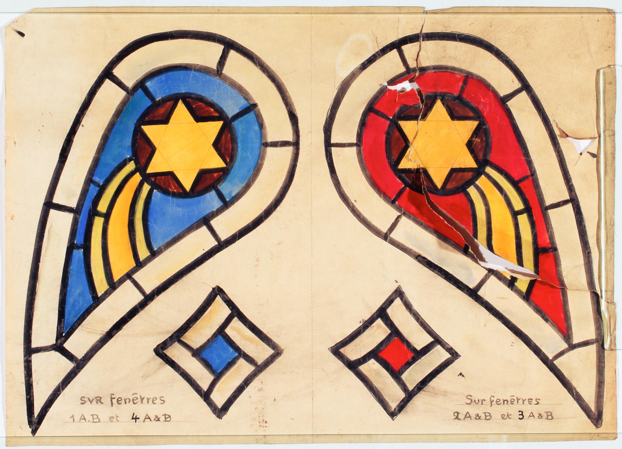 Ce carton en couleur est le modèle précis à l’échelle 1:1 des motifs ornementaux du réseau de chaque lancette de l’ensemble des vitraux de l’église Saint-Jacques à Nuvilly. Sur le carton, l’artiste mentionne que ces motifs sont destinés aux fenêtres de la nef, mais oublie de mentionner qu’ils s’appliquent également aux deux verrières du choeur