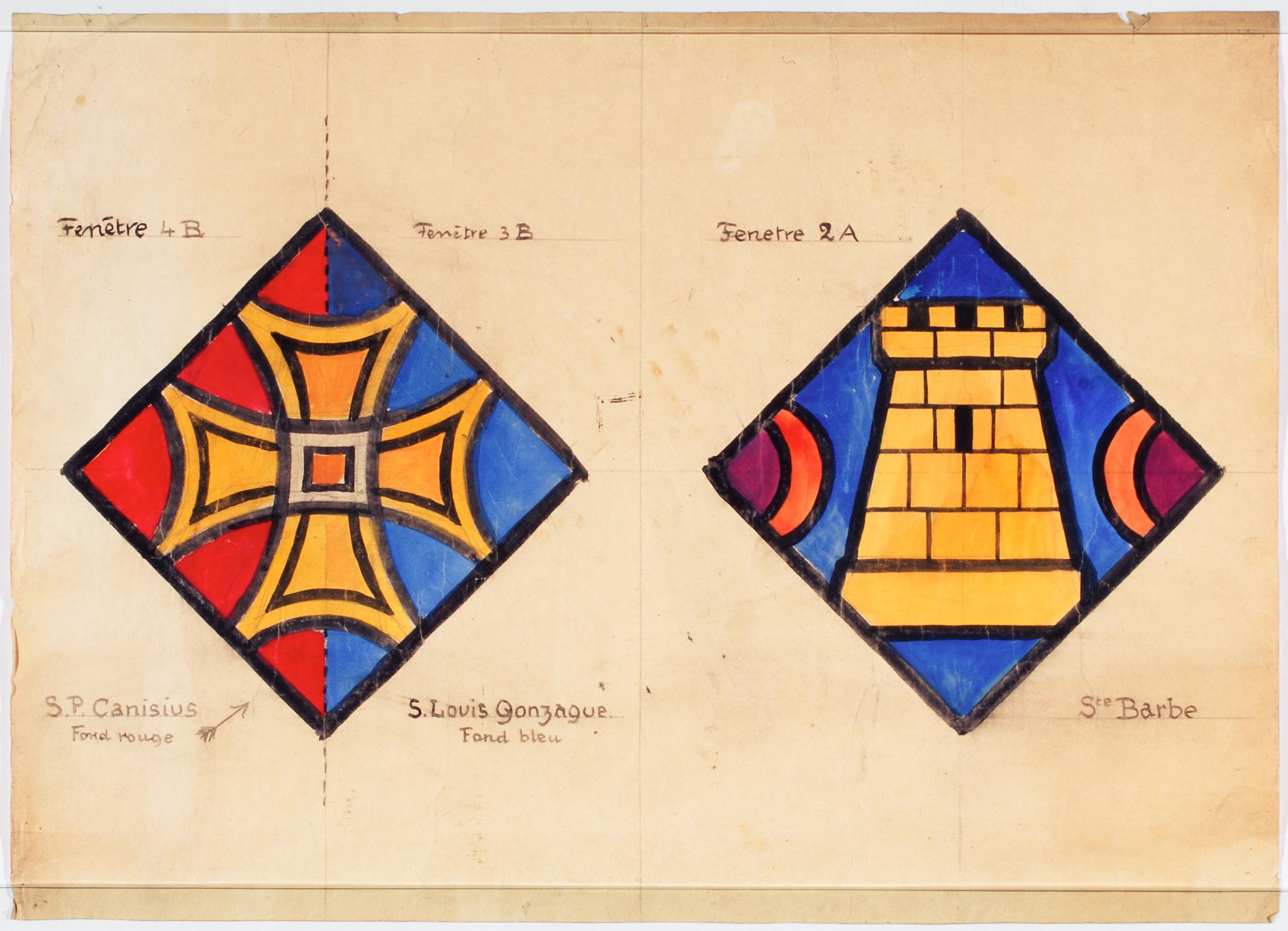 Ce carton en couleur est le modèle précis à l’échelle 1:1 des parties inférieures ornementales des lancettes droites des vitraux consacrés à saint Jacques et saint Louis de Gonzague, saint Joseph et saint Pierre Canisius et sainte Cécile et sainte Barbe pour la nef de l’église Saint-Jacques à Nuvilly. Toute la partie ornementale autour de chaque losange manque et fait l’objet d’un détail sur le carton KF_891.