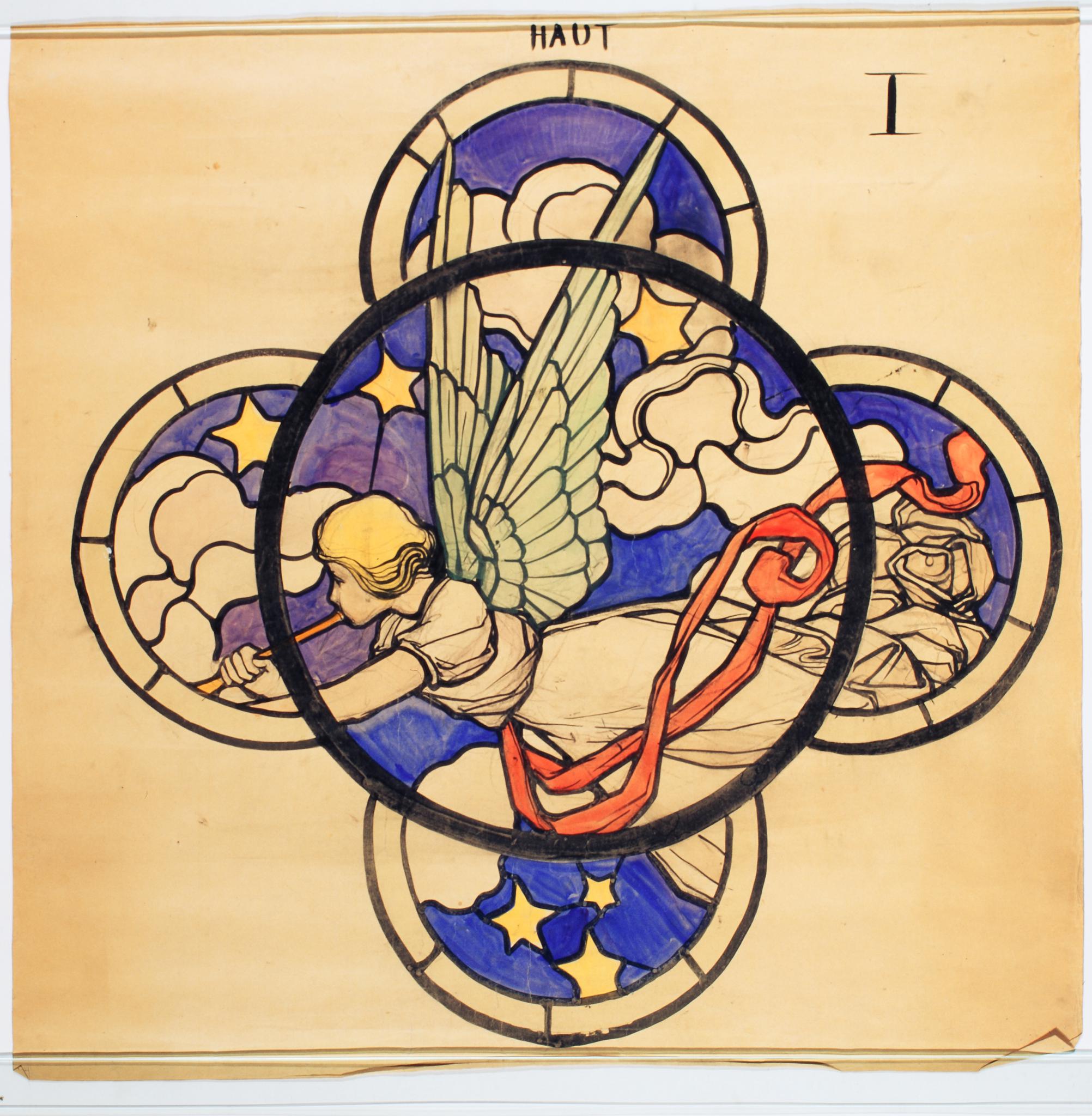 Ce carton en couleur à l’échelle 1:1 est le projet pour le quadrilobe inférieur droit du vitrail du transept à droite de l’église Saint-Martin de Cugy sur le thème “Je crois la résurrection de la chair”. Cette fenêtre comprend deux autres quadrilobes dans lesquels sont représentés un second ange jouant de la trompette et le Christ en gloire (Pasquier, 1999, p. 28).