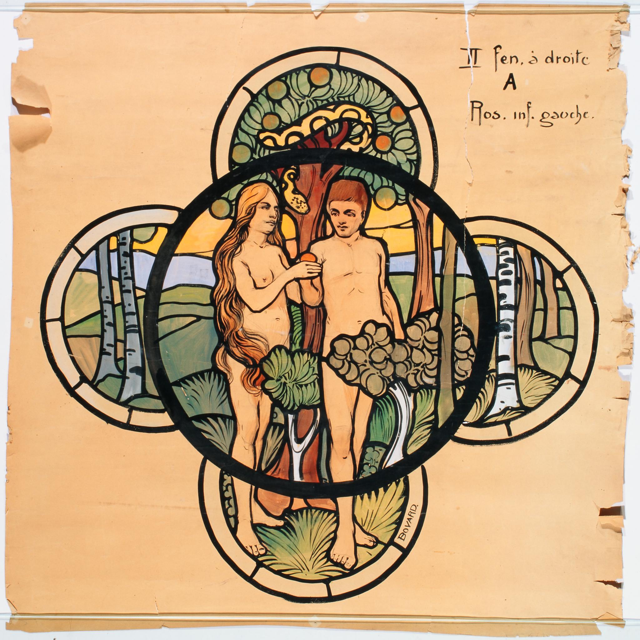 Cette fenêtre, consacrée au mystère de l’Incarnation, devait selon le premier projet iconographique de l’abbé Gambon comprendre dans les trois quadrilobes la Nativité, l’Adoration des bergers et l’Epiphanie, ou l’Annonciation, la Nativité et la Vierge à l’enfant. Finalement, l’abbé opte pour une lecture typologique du thème de l’Incarnation, avec la Genèse comme préfiguration de la naissance du Christ et Eve en opposition à Marie (Pasquier, 1999, p. 14-16).