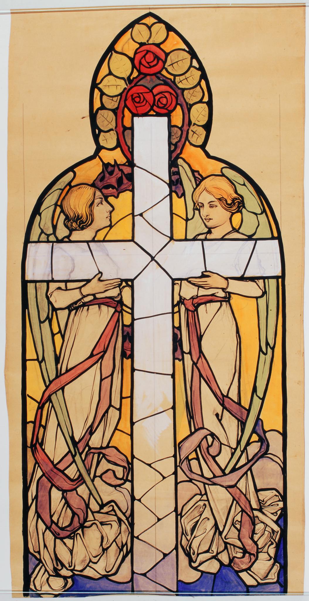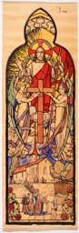 Ce carton en couleur à l’échelle 1:1 est le projet définitif pour la partie supérieure de la lancette centrale du vitrail du transept situé à gauche dans l’église Saint-Martin de Cugy sur le thème “Je crois la résurrection de la chair”.
