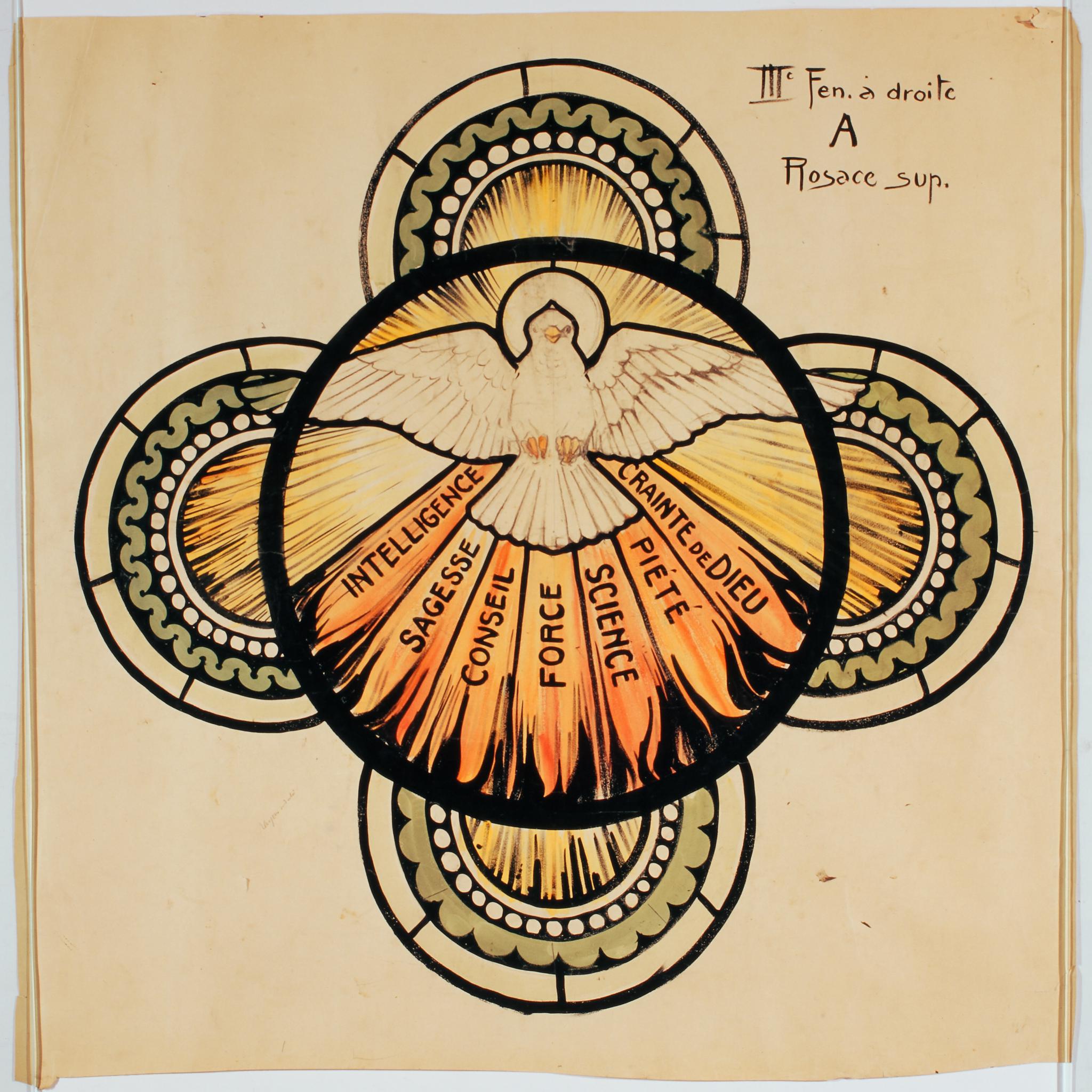 Ce carton en couleur à l’échelle 1:1 est le projet définitif pour le quadrilobe supérieur de la verrière de la troisième travée à droite dans la nef de l’église Saint-Martin de Cugy, dédiée au thème “Je crois au Saint-Esprit sanctificateur”. Cette fenêtre comprend deux autres quadrilobes dans lesquels sont représentés la Crucifixion et le temple de l’Esprit (Pasquier, 1999, p. 19-21).