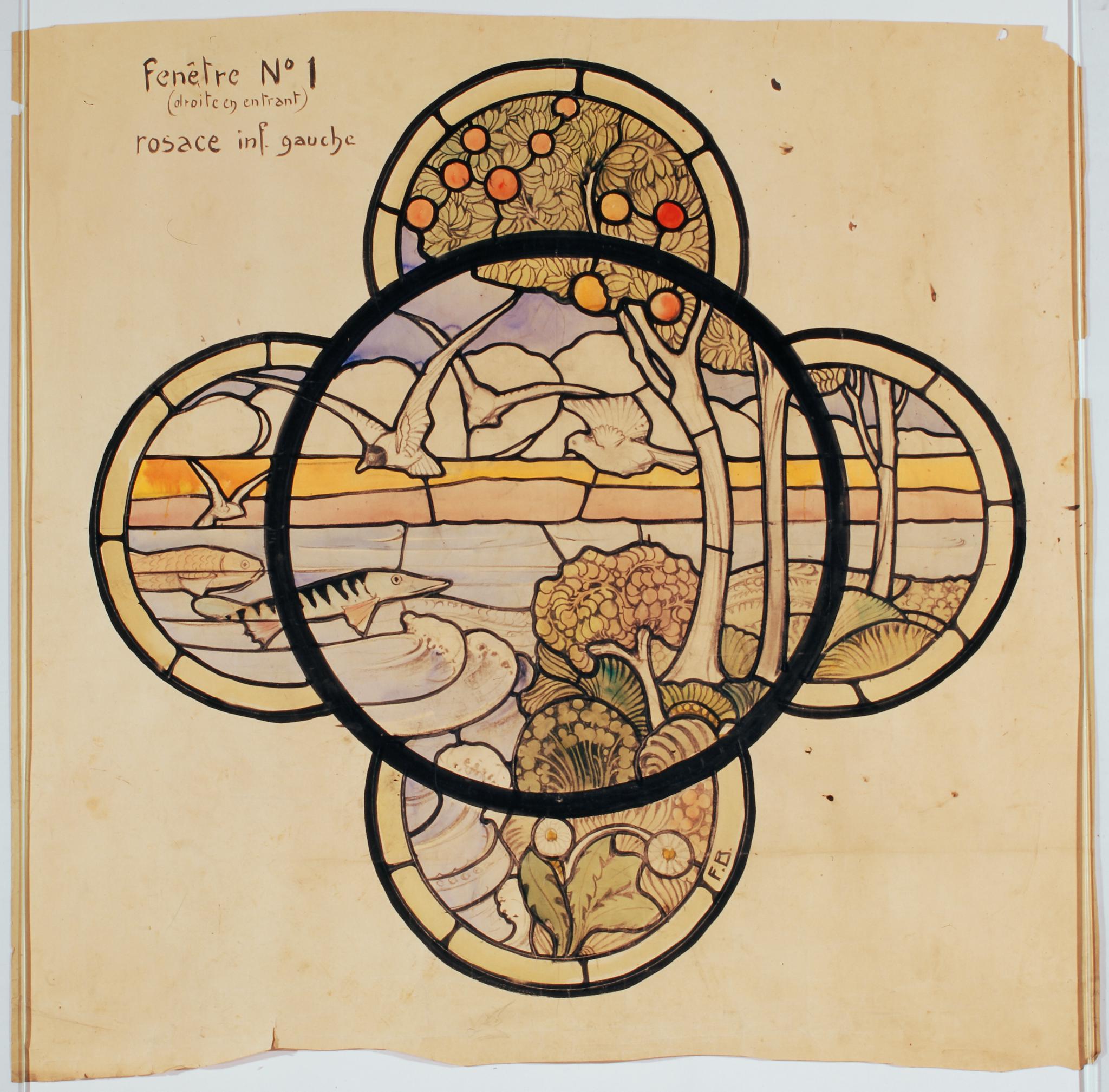 Ce carton en couleur à l’échelle 1:1 est le projet définitif pour le quadrilobe droit du vitrail de la première travée de la nef à droite dans l’église Saint-Martin de Cugy, sur le thème : “Je crois en Dieu créateur”. Cette fenêtre comprend deux autres quadrilobes dans lesquels sont représentés les autres jours de la création (Pasquier, 1999, p. 9-11).