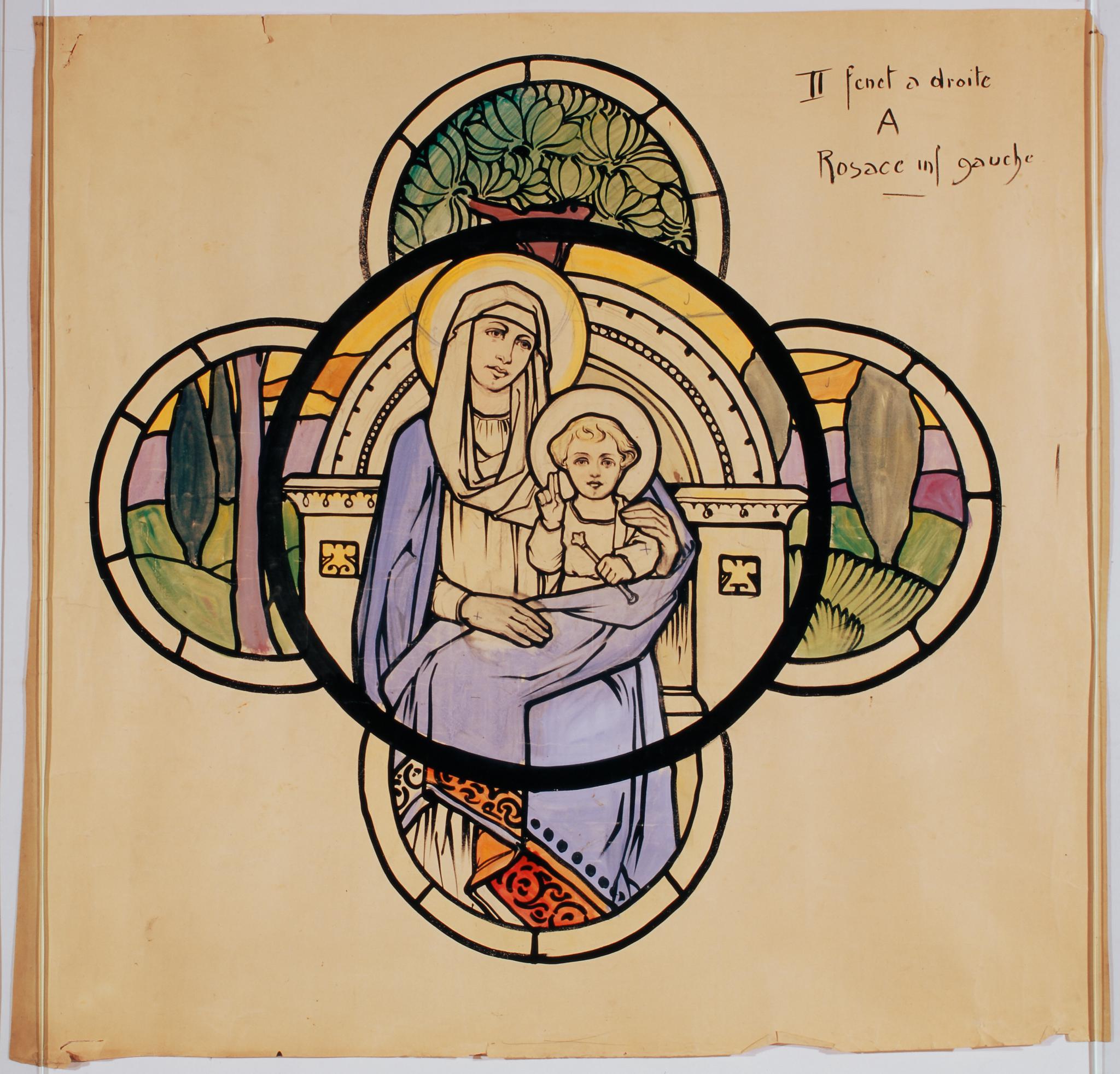 Ce carton en couleur à l’échelle 1:1 est le projet définitif pour le quadrilobe inférieur droit de la verrière de la deuxième travée à droite dans la nef de l’église Saint-Martin de Cugy, dédiée au thème “Je crois au fils de Dieu fait homme”. Cette fenêtre comprend deux autres quadrilobes dans lesquels sont représentées la création d’Adam et Eve et la Nativité (Pasquier, 1999, p. 14-17).