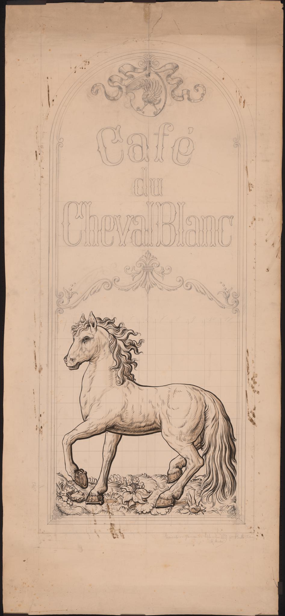Au premier plan en bas, un cheval est présenté de profil au trot. Il figure sur de l’herbe parsemée de fleurs, trèfles et cailloux. Au-dessus, est représenté un motif ornemental en accolade. En haut, les armoiries de Gruyères sont surmontées d’un ruban ondulé. Le nom de l’établissement “Café du Cheval Blanc” figure au-dessous.