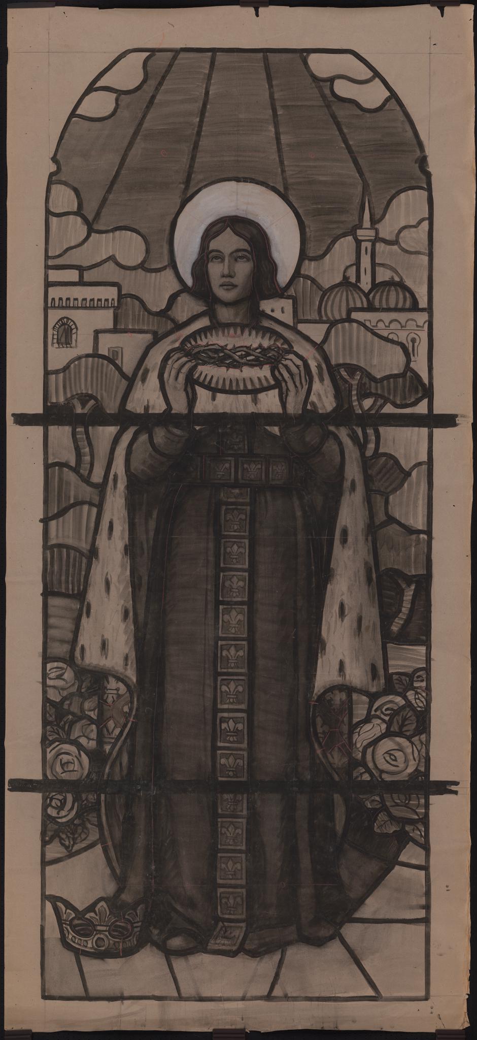 Saint Louis, debout de face devant un parterre de roses tient une couronne d’épines de ses deux mains devant sa poitrine. Il est vêtu d’une cape d’hermine. A ses pieds à gauche, est posée sa couronne royale. A l’arrière-plan, derrière un bosquet d’arbres, sont représentés à droite un sanctuaire à coupole et un minaret, et à gauche un bâtiment civil.