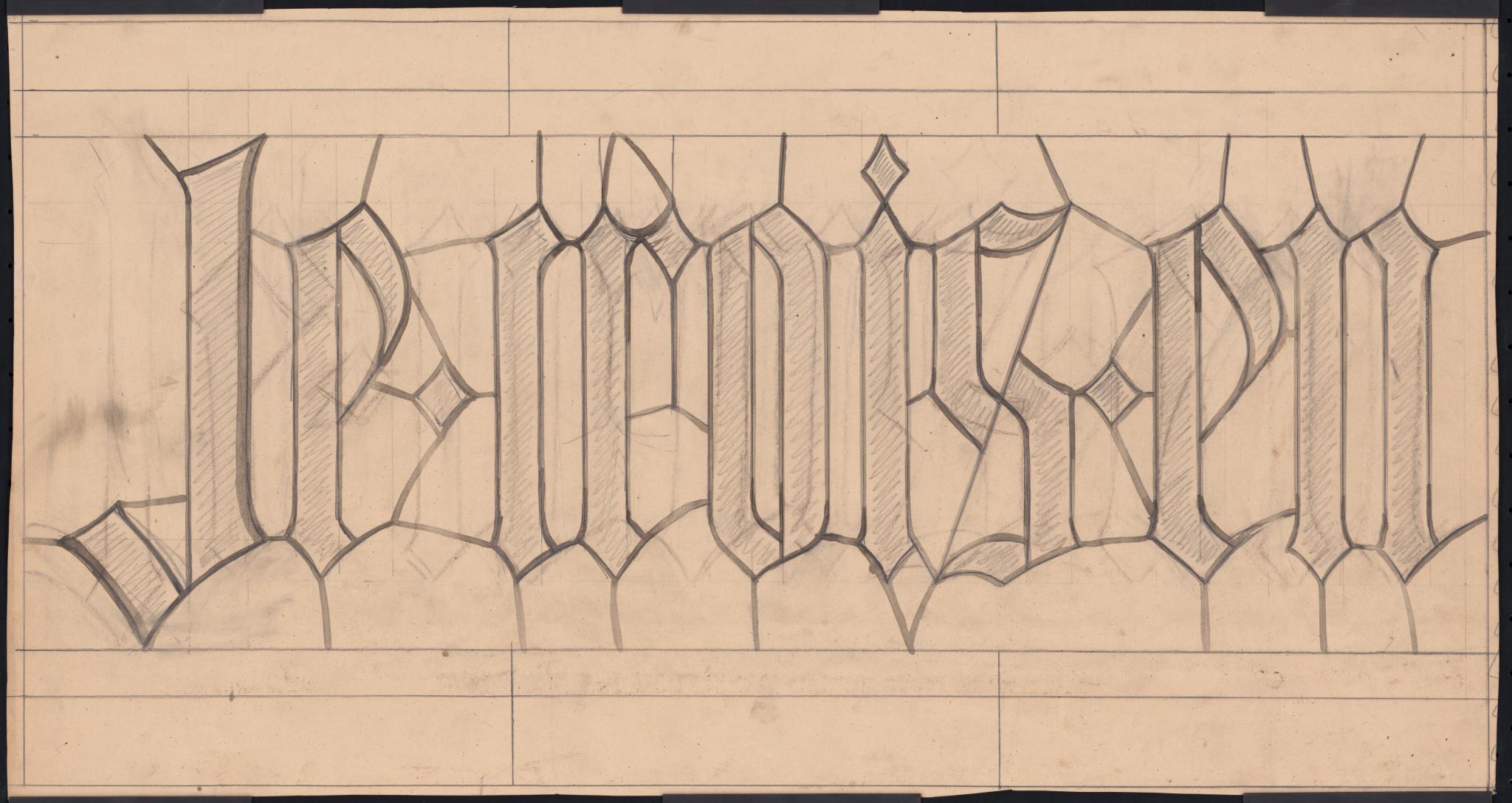 Inscription partielle en lettres gothiques, pour le bas d'un vitrail.