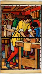 Au début des années trente, Henri Broillet, devenu conservateur du Musée d’art et d’histoire de Fribourg en 1928, n’a pas une grande production verrière. Il vient de terminer trois vitraux pour l’église Saint-Martin à Avry-devant-Pont et en 1934 obtient le mandat pour la réalisation de la rose du Sacré-Coeur pour la façade occidentale de l’église Saint-Pierre à Fribourg. Les deux verrières de l’imprimerie s’inscrivent dans la même lignée stylistique que ses créations à Avry-devant-Pont.