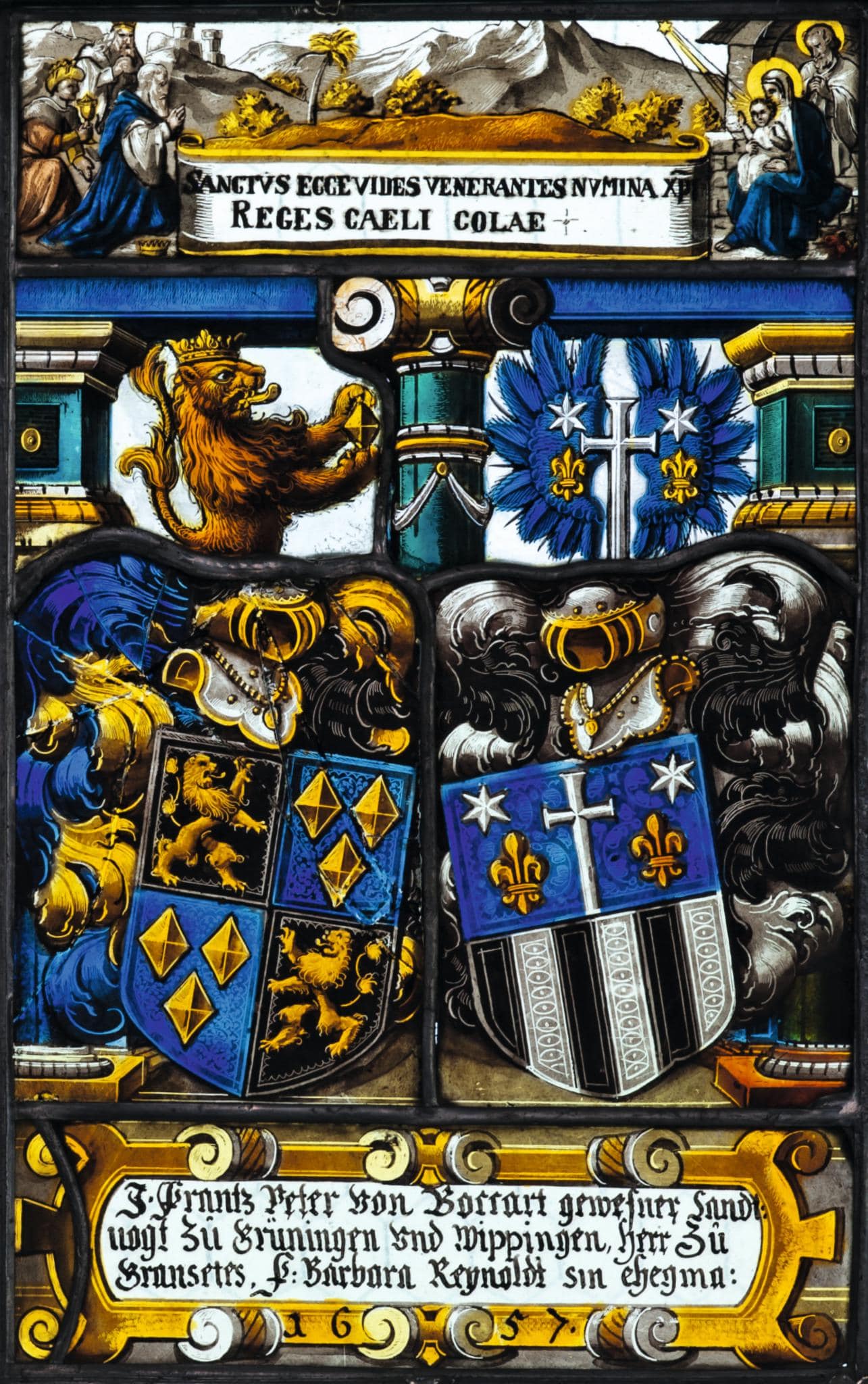Stifterinschrift: J. Frantz Peter von Boccart gewesner Landt= / uogt zu Grüningen vnd Wippingen, herr zu / Gransetes. F: Barbara Reynoldt sin ehegma: / 1657.