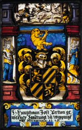 Die einander leicht zugeneigten vollen Stifterwappen stehen vor gelbem Grund. Sie überdecken einen Grossteil der aus kräftigen Rahmenpilastern und einer Mittelsäule bestehenden Architektur. Über dem abschliessenden geraden Gebälk schwebt der Engel Gabriel mit der frohen Botschaft der Verkündigung in umwölktem Strahlenkranz auf die am Betpult sitzende Jungfrau Maria zu. Zwischen beiden vermittelt die Heiliggeisttaube und ein ausgerolltes Band mit der lateinischen Devise des Stifters: “Weder die Wachsoldaten noch die pfeilerbewehrte Festung schützt so gut wie die Liebe [der Untertanen]” (Aus den zwölf Lobreden des Claudius Claudianus [um 375–nach 404] auf das vierte Konsulat des Kaisers Honorius. Panegyricus de quarto consulatu Honorii Augusti, Vers 280. Auf Französisch interpretiert: Plus sûr que les guerriers et les armes, l’amour des sujets est la garde des rois.). Am Fuss steht in einer breiten Rollwerkkartusche die Stifterinschrift.