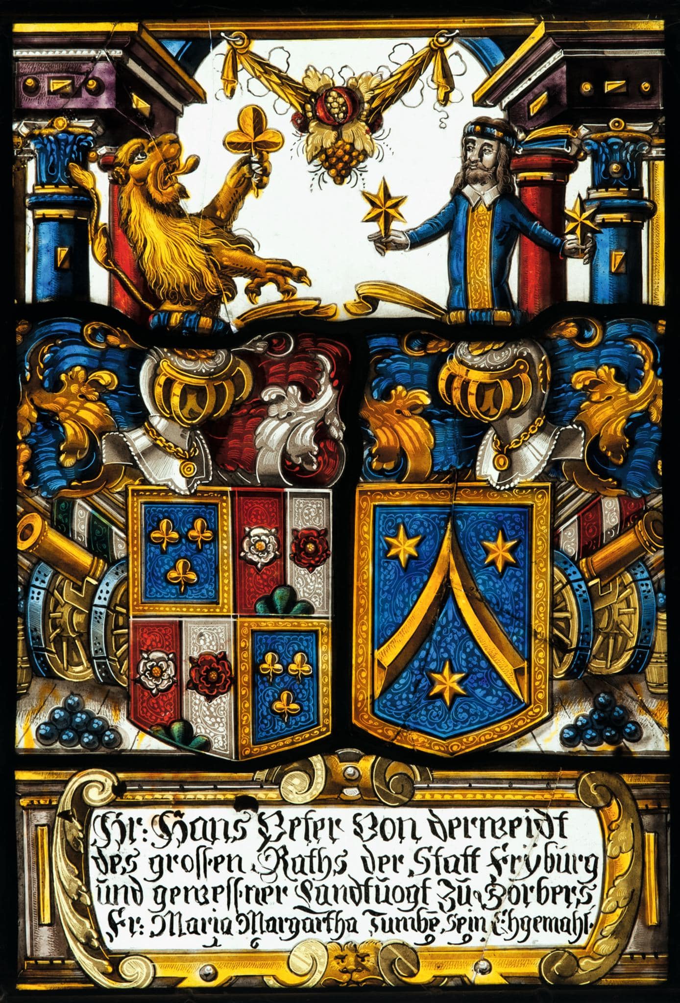 Stifterinschrift: Hr: Hans Peter Von derweidt / des grossen Raths der Statt Frÿburg / und gewessner Landtuogt zu Gorbers, / Fr: Maria Margartha Thumbē sein Ehgemahl. / 1699.
