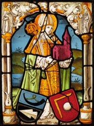 Figurenscheibe um 1517: Hl. Wolfgang mit unbekannten Wappen