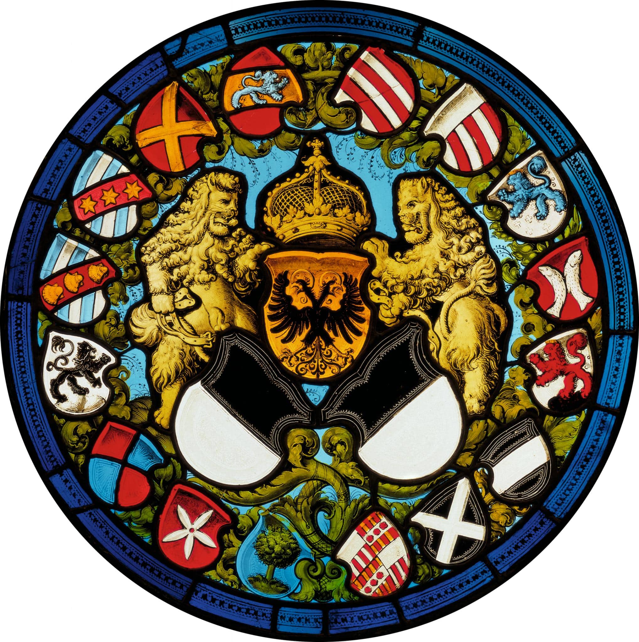 Die gekrönte Wappenpyramide steht über verschlungenen Blattstielen. Sie wird vor hellblauem rankenverziertem Grund von Löwen begleitet, deren eine Pranke die Schilde mit Gurten hält, deren andere auf dem Reichswappen ruht. In einem grünen umlaufenden Blätterkranz sind die sechzehn Ämterwappen verteilt. Sie orientieren sich an der senkrechten Achse und sind in heraldischer Höflichkeit einander zugeneigt. Damit gelingt dem Glasmaler nicht nur ein kompositionell, sondern auch inhaltlich überzeugendes Werk.