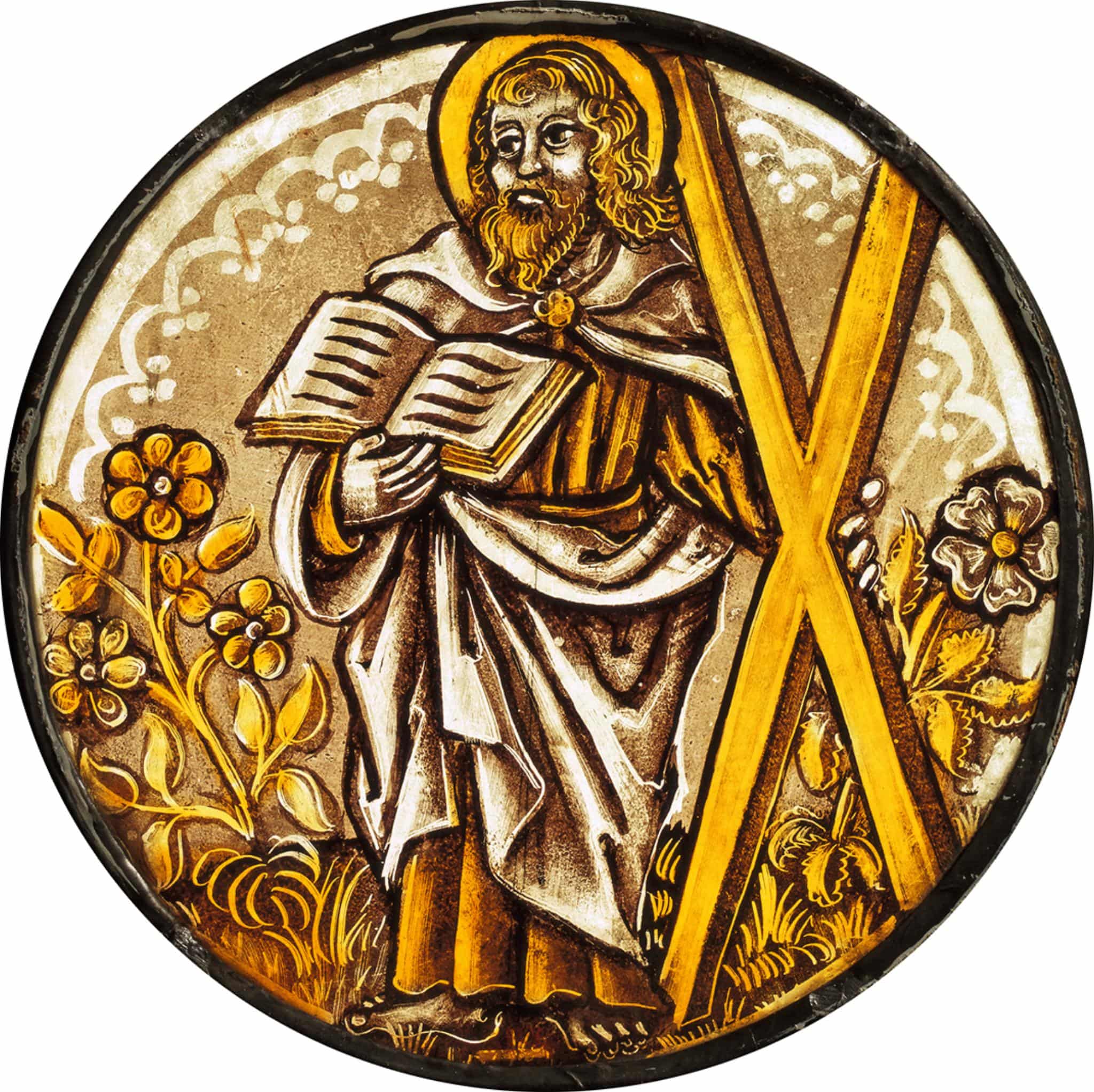 Die Figur des hl. Andreas knüpft in der Gestaltung seiner grossen Augen und seines vollen Mundes an weitere Werke in und aus den Kantonen Freiburg (FR_44, FR_346, Bergmann 2014. Bd. 1. Abb. 287, 288) und Waadt an (Bergmann 2014. Bd. 1. Abb. 290, 291). Stilistisch muten die Grisaillescheiben im Kreis der eidgenössischen Wappenscheiben fremd an. Es darf daher angenommen werden, dass sie wie die Scheiben des Königs von Frankreich und Herzogs von Savoyen (FR_34, FR_35) aus der Hand eines savoyisch geschulten Lausanner Glasmalers stammen (vgl. dazu v. a. Bergmann 2014. Bd. 1. S. 406–412).