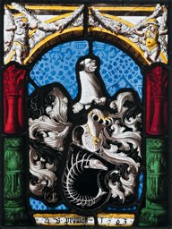 Erhaltung: Einzelne Sprünge und Notbleie. Zwei Ergänzungen im Hintergrund und Wappen, drei kleinere im Oberbild rechts und in der Säulenbasis rechts unten.