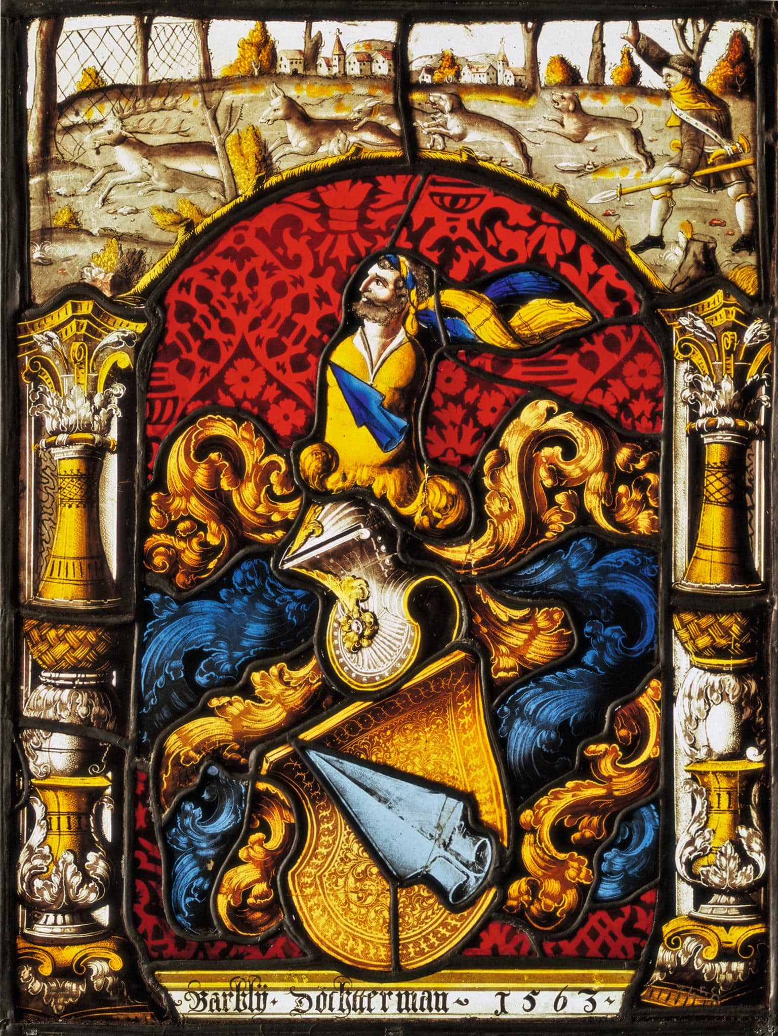 Zwischen zwei reichen blattverzierten Balustersäulen nimmt vor rotem Damastgrund das volle Wappen Techtermann das Mittelbild ein. Das Oberbild zeigt über dem schmalen Astwerkbogen eine Jagdszene: in einer weiten dörflichen Landschaft treiben Hunde einen Hirschen und ein Reh in das zwischen Bäumen aufgespannte Fangnetz. Der Jäger, der seine Jagdhunde mit einer Geste vorhetzt, folgt rechts mit dem Spiess in der Hand, mit Pelzmütze und Halstuch warm gekleidet und das Horn um die Hüfte gebunden. In der Fusszone nennt die Inschrift die Stifterin und das Stiftungsdatum.