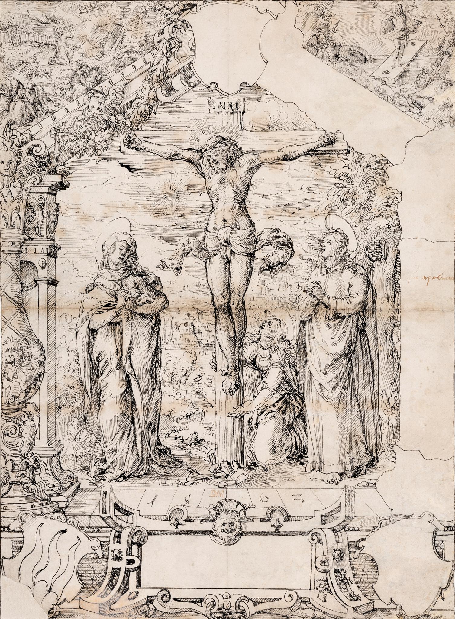 Der Riss zeigt im Mittelbild die Kreuzigung vor der Stadt Jerusalem. Christus hängt mit flatterndem Lendentuch und geballten Händen am Kreuz. Am Fuss desselben umfasst Magdalena kniend den Kreuzbalken. Links trauert Maria mit ringenden Händen, rechts blickt der Jünger Johannes zu Christus empor. Die reich ornamentierte Rahmenarchitektur ist nur im linken Teil ausgeführt. Einem Nischenpilaster steht eine gebauchte Säule mit Kreuzbanddekor und Löwenkopfmasken vor. Der Dreiecksgiebel ist mit Puttenköpfen und Girlanden reich verziert. Auch die Oberbilder sind der Passion gewidmet. Links kniet Christus im Dialog mit dem Engel am Ölberg, während die Apostel im Schlaf versunken sind und sich im Hintergrund die Häscher nähern. Rechts steht Christus im Siegesmantel mit Kreuzstab und vom Strahlenkranz umgeben auf der Steinplatte des offenen Grabes. Am Fuss bleibt die aus Beschlagwerk gebildete Inschriftkartusche vor dem bühnenartigen Sockel leer. Von den drei Wappen – eines im Scheitel des Dreieckbogens, die beiden anderen seitlich der Inschrifttafel – trägt nur das untere links ein Schildbild.