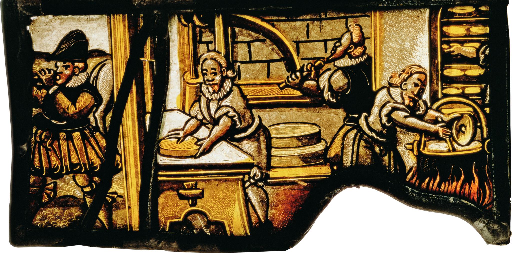 FR_74: Fragment eines Scheiben-Oberbildes um 1600: Käseherstellung