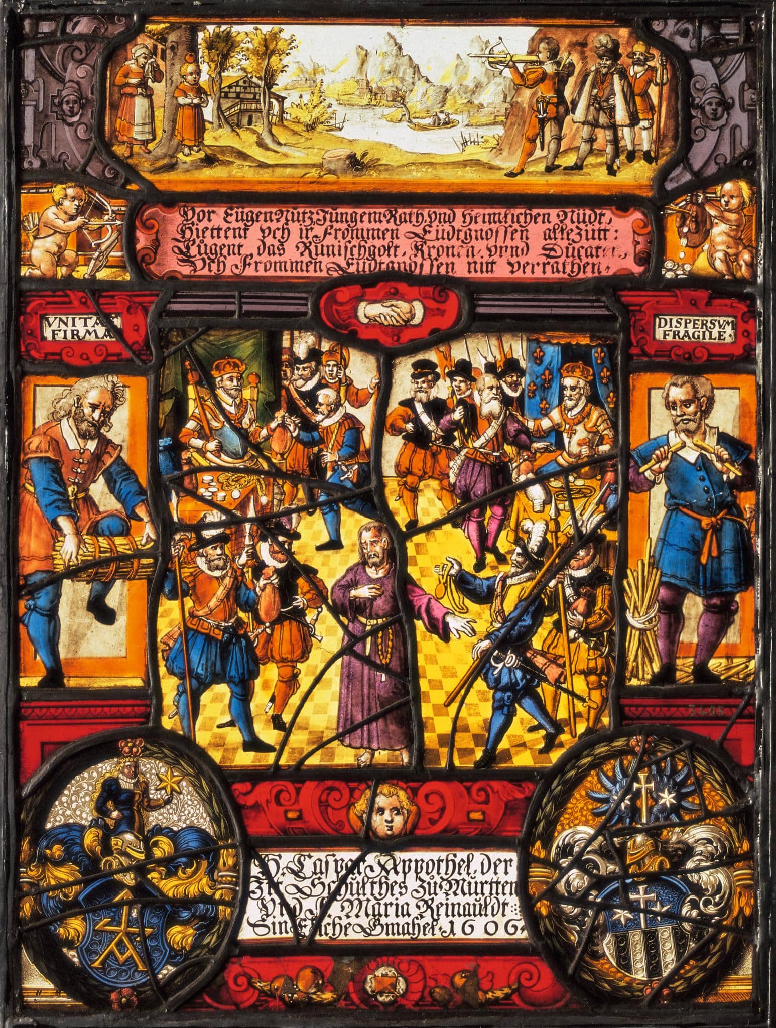Über den Seitenfiguren: VNITAS FIRMA, DISPERSVM FRAGILE.