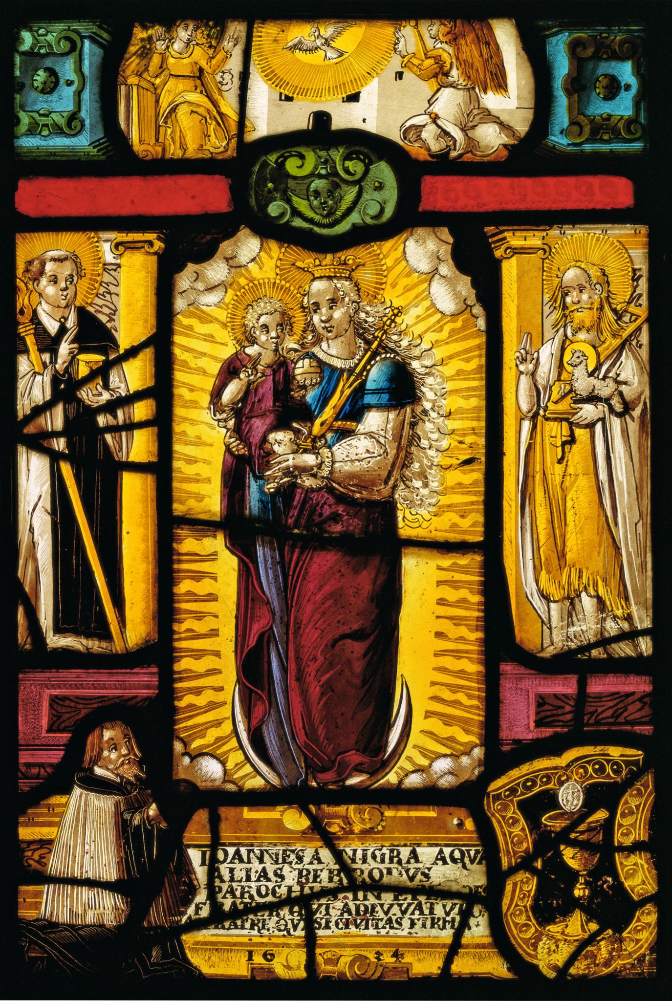 Im Mittelbild steht, umgeben von einem umwölkten Strahlenkranz, die mit einem blauen Gewand und einem violetten Mantel bekleidete Muttergottes auf der Mondsichel. Als Himmelskönigin trägt sie Krone und Zepter. Sie hält im rechten Arm das segnende Jesuskind mit der Weltkugel. Vor den seitlichen Wandabschnitten mit schmalen Pilastern stehen zwei Heilige: links der hl. Benedikt von Nursia im Ordenshabit mit Abtstab und dem Giftglas in der Linken (Der Ordensheilige Benedikt verweist möglicherweise auf die verschiedensten Beziehungen der Pfarreien Ependes und Arconciel zum nahegelegenen Zisterzienserkloster Hauterive), rechts der Namenspatron des Stifters. Der hl. Johannes der Täufer trägt das härene Gewand und einen Mantel. Die Rechte im Segensgestus erhoben, hält er in der Linken das Buch, auf dem das Lamm Gottes mit dem geschulterten Kreuz liegt. Im Oberbild ist zwischen zwei blauen Podesten die Verkündigung an Maria dargestellt, die links am Betpult kniet. Der Engel eilt von rechts zu ihr. Voraus schwebt die Taube des hl. Geistes. Am Fuss der Scheibe wird die Inschrift eingefasst vom Wappen rechts und vom Bildnis des Stifters, der links in geistlicher Tracht betend zu Füssen der Muttergottes kniet. Seine lateinische Devise entnahm der Priester der Vulgatabibel: “Der Bruder, dem durch einen Bruder geholfen wird, ist wie eine feste Stadt” (Vulgata latina, Proverbia 18, 19).