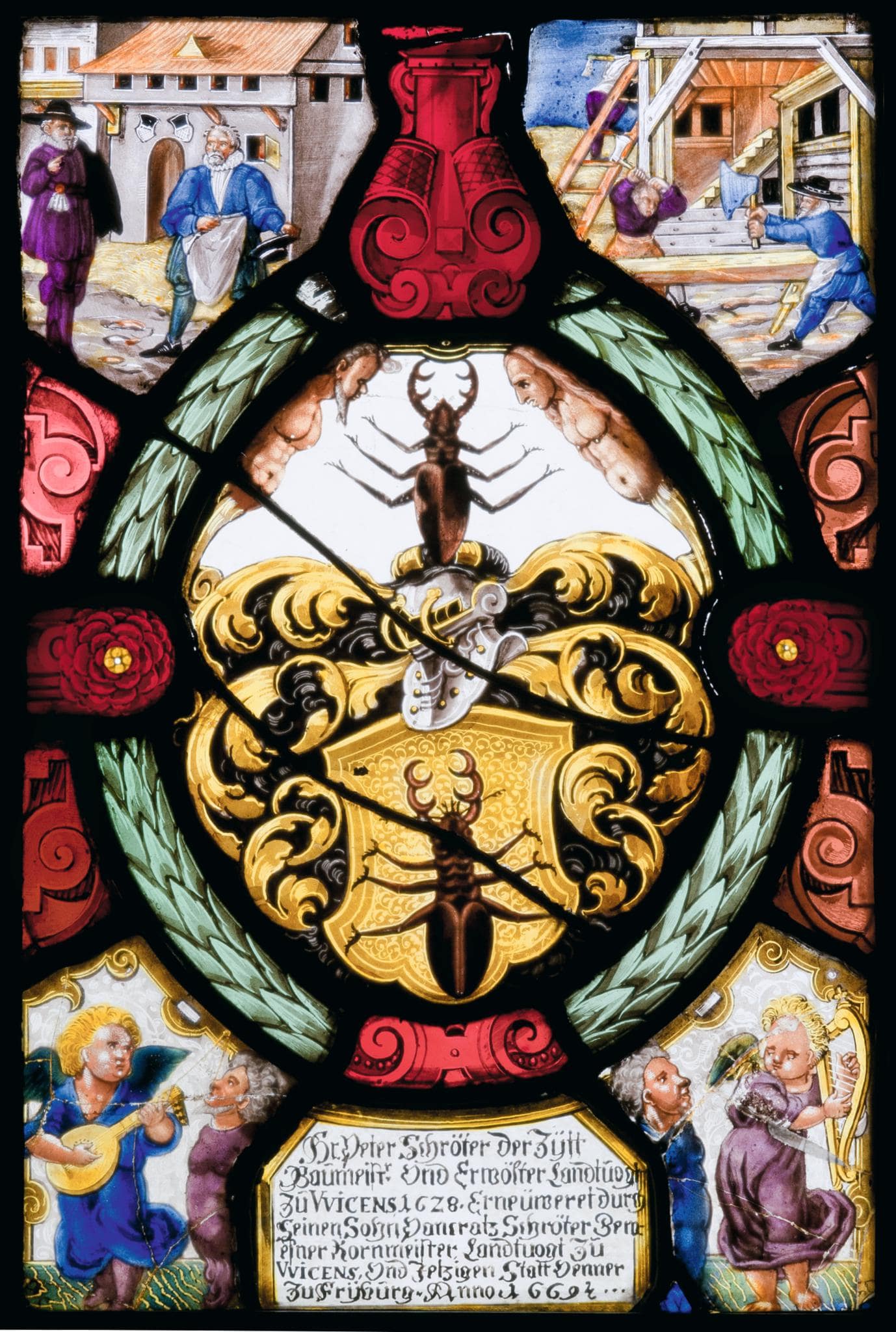 Das Wappen Schröter ist in einen ovalen Lorbeerkranz eingeschrieben, auf dessen Innenseiten zwei Karyatiden die rote Scheitelkartusche tragen. Die abschliessenden oberen Zwickel sind mit Szenen aus dem Berufsalltag des Baumeisters ergänzt: Links trifft der Meister vor einem Gebäude einen Auftraggeber, rechts arbeiten Zimmerleute an einem Dachstuhl. In den unteren Zwickeln begleiten musizierende Putten mit wehenden Gewändern die von Hermen gerahmte Inschrifttafel.