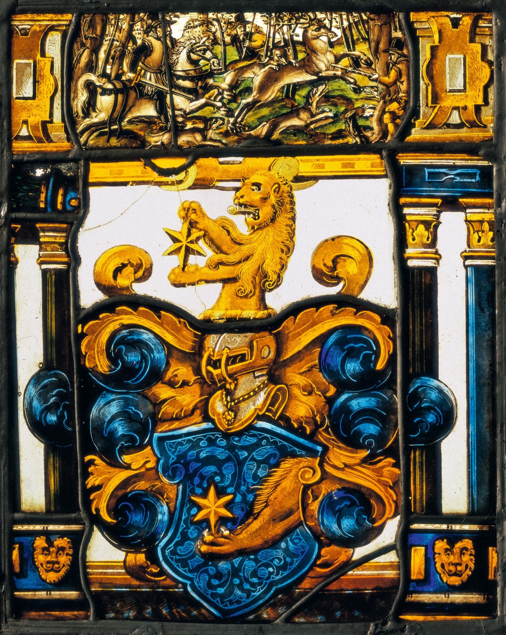 Zur ursprünglichen Scheibe gehört allein das von einer doppelten Säulenstellung mit einem blauen, links beschnittenen Architrav eingefasste Wappen. Es steht auf einem marmorierten Boden vor farblosem Grund und unter einem abschliessenden gelben Gebälk mit einer Volute. Die Jagdszene im Stil des Monogrammisten CH, Christoph Heilmann, ist eingeflickt. Die Podeste mit Löwenköpfen stammen aus einer späteren Scheibe um 1690. Eine Stifterinschrift fehlt heute.