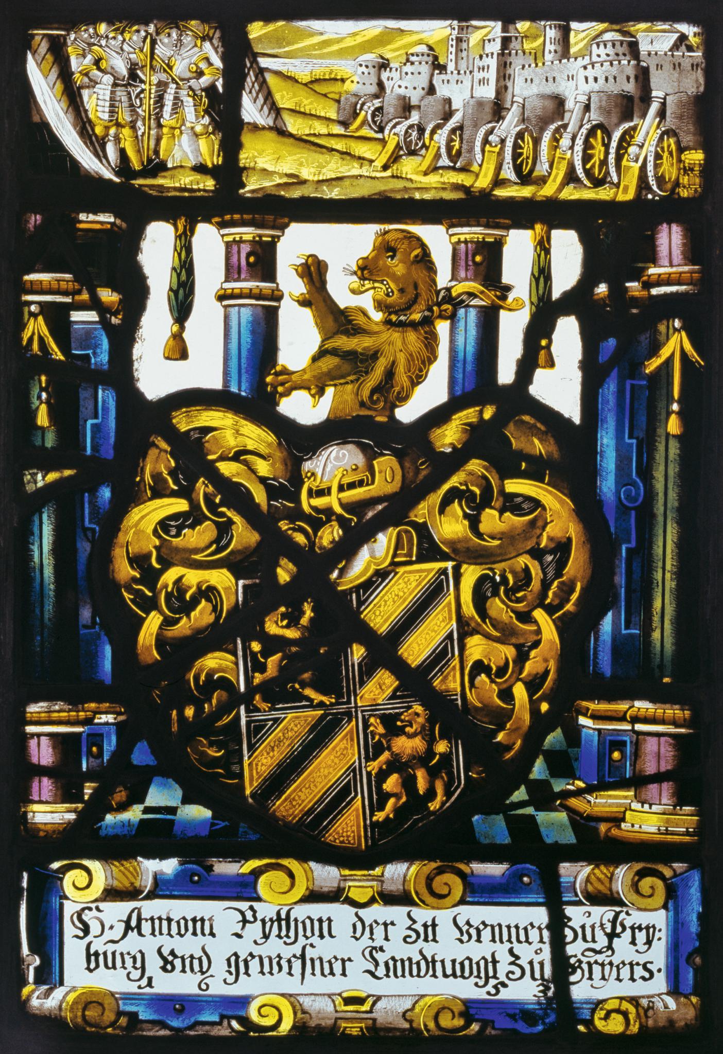 Zehn Jahre nach diesem Glasgemälde stiftete Anton Python 1663 eine doppelt so grosse Scheibe (FR_148). Erhalten hat sich auch sein Siegel um 1645 als Landvogt von Greyerz (StAF Korrespondenz der Landvogtei Greyerz).