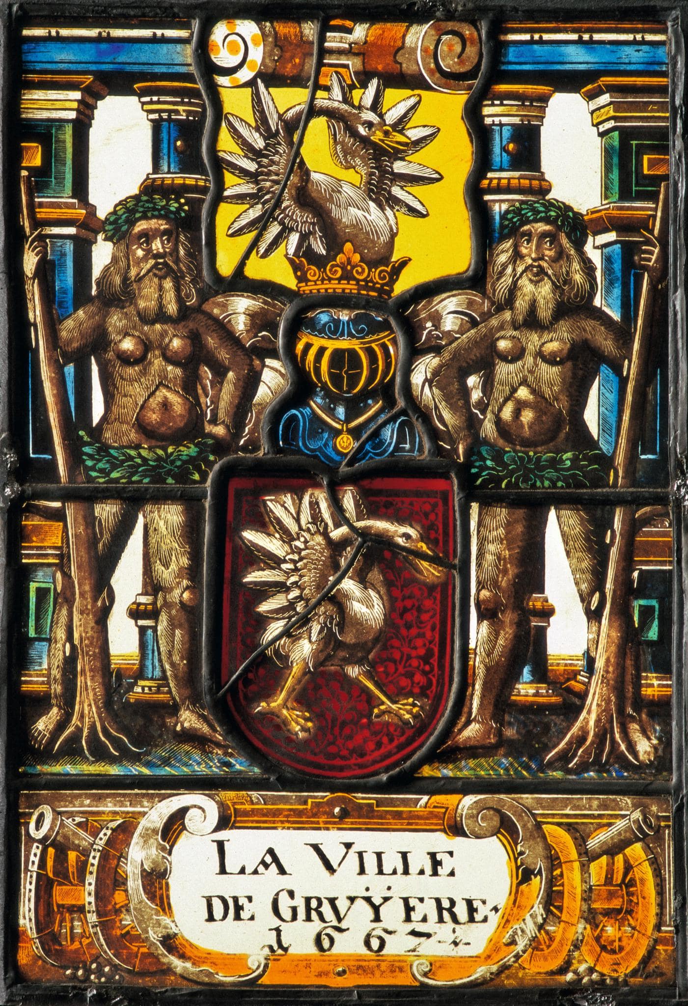 Zwei über blau-grün-gelb gemustertem Boden stehende Wilde Männer bewachen vor einer dreiachsigen Architektur und vor farblosem Hintergrund das Wappen von Greyerz, dessen Helmzier vor gelbem Grund hervorsticht. Die Wilden Männer sind spiegelbildlich symmetrisch angeordnet. Die bärtigen, bis auf Brust, Bauch, Ellbogen und Knie sowie Hände und Füsse mit einem dichten Haarkleid versehenen Männer tragen auf den langhaarigen Häuptern und um die Hüften grüne Laubkränze und halten als Waffe ausgerissene Baumstämme in ihren Händen. Die Architektur besteht aus blau-grün-gelben Pilastern und blauen Säulen, die ein gerades blaues Gebälk mit gelber Volutenkartusche im Zentrum tragen. Am Fuss steht zwischen Kanonen in einer gelben Rollwerkkartusche die Stifterinschrift.