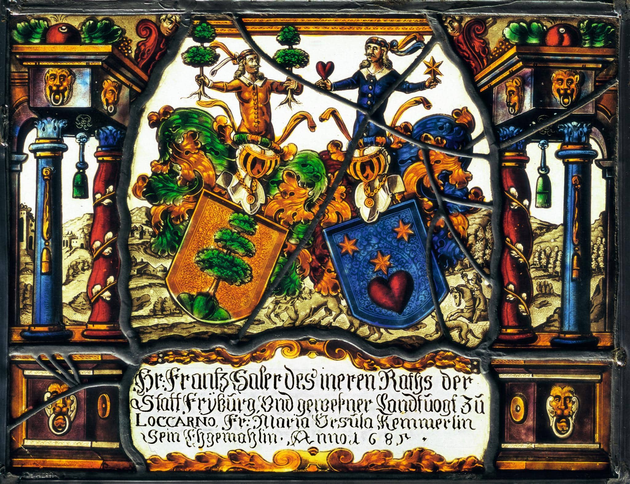 Stifterinschrift: Hr: Frantz Saler des ineren Raths der / Statt Frÿburg, und geweßner Landtuogt zu / Loccarno, Fr: Maria Ursula Kemmerlin / Sein Ehgemahlin. Anno 1685.