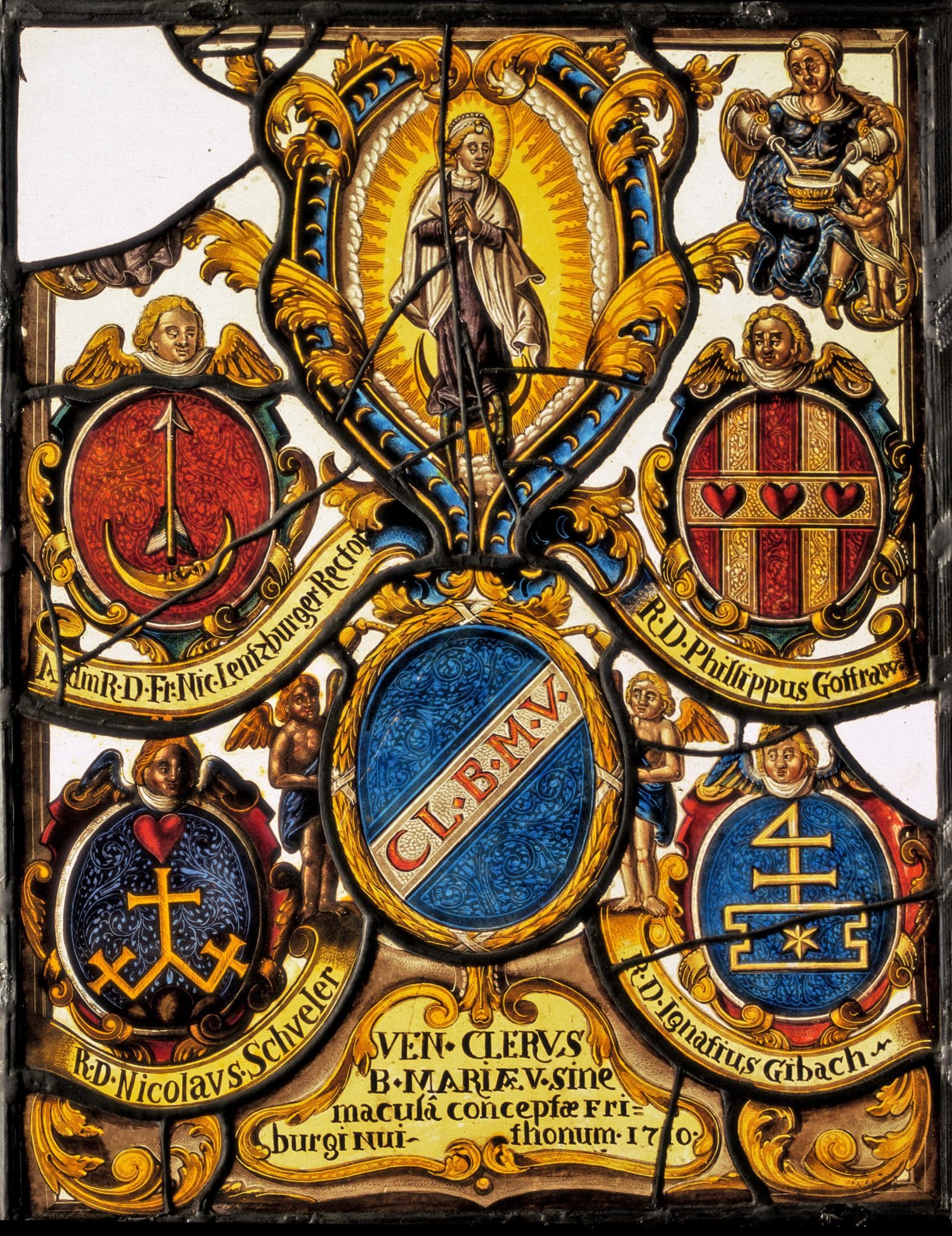 Stifterinschriften (Mitte): VEN. CLERVS / B. MARIÆ. V. sine / maculâ conceptæ Fri= / burgi Nui- thonum. 1710.