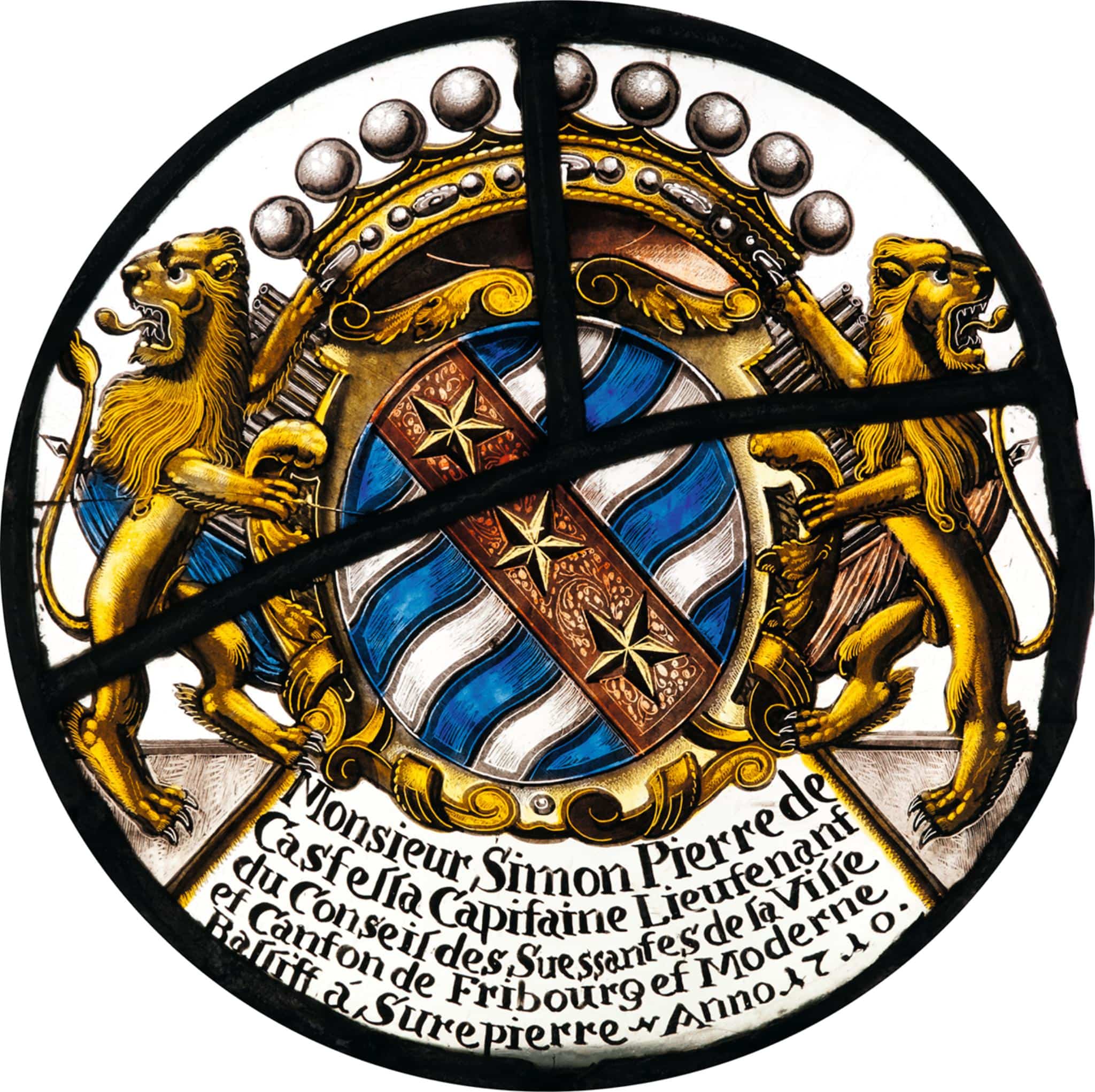 Stifterinschrift: Monsieur Simon Pierre de / Castella Capitaine Lieutenant / du Conseil des Suessantes de la Ville et Canton de Fribourg et Moderne / Balliff á Surepierre. Anno 1710.