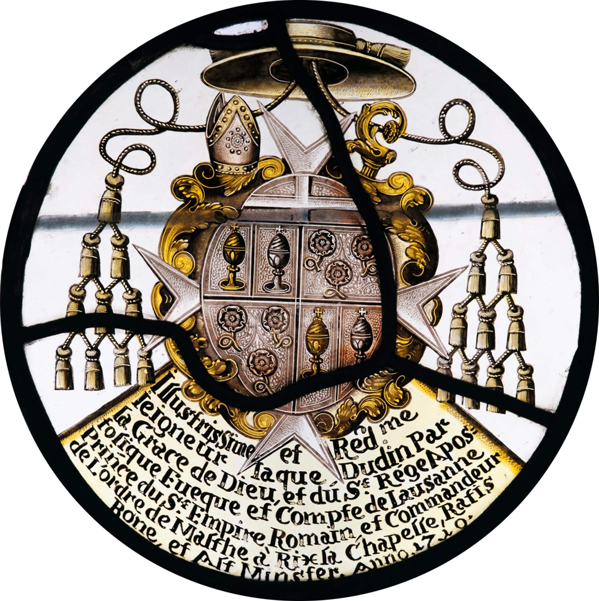 Jacques Duding weihte als Bischof von Lausanne die Schlosskapelle Delley ein. Er gehörte zu den Stiftern einer Scheibe, die den Ehrenplatz gegenüber der Scheibe des Schlossherren im oberen Rund des altarnahen Fensters einnahm. Geboren am 23.8.1641 in Riaz als Sohn von François Duding und Marie Gobet, studierte Jacques Duding bei den Jesuiten im Kollegium St. Michael in Freiburg. Mit 16 Jahren trat er in den Johanniterorden ein, nahm an den Türkenkriegen teil und wurde Seelsorger der Galeerensträflinge. 1681 erlangte er den Doktortitel in Theologie, 1696 in Zivil- und kanonischem Recht. Er amtete zunächst als Komtur in Aachen, Regensburg und Altmühlmünster, bevor er 1701 oberster Leiter der Johanniter in Freiburg i. Ü. wurde. 1707 ernannte ihn Papst Clemens XI. zum Bischof von Lausanne. Als solcher bemühte er sich um die Kirchendisziplin und setzte sich – allerdings ohne Erfolg – dafür ein, einen Bürger- und Religionskrieg in der Eidgenossenschaft zu verhindern, der als zweiter Villmergerkrieg in die Geschichte eingehen sollte. Er wertete die Komturei auf, die er zu seiner Residenz erkor, resignierte jedoch 1710 die Kommende zugunsten seines Neffen Claude Antoine Duding. Unter seinem Episkopat bemühten sich 1714 die Freiburger nochmals vergeblich, ihre Kollegiatskirche in eine Kathedrale zu erheben. Duding starb am 16.11.1716. Sein Grabstein befindet sich in der Kirche St. Johann (Strub. Kdm FR II. 1956. S. 220, Abb. 230; Lüthi 2013. Bd. II. S. 238–239). Porträts des hohen Kirchenvertreters werden im Museum für Kunst und Geschichte Freiburg, im Kloster Bisemberg, in der Bischöflichen Residenz und im Freiburger Seminar bewahrt (vgl. Vevey Armorial I. 1935. S. 28. Inv.-Nr. MAHF 4030. Strub. Kdm FR II. 1956. S. 243; Strub. Kdm FR III. 1959. S. 232, Nr. 2).