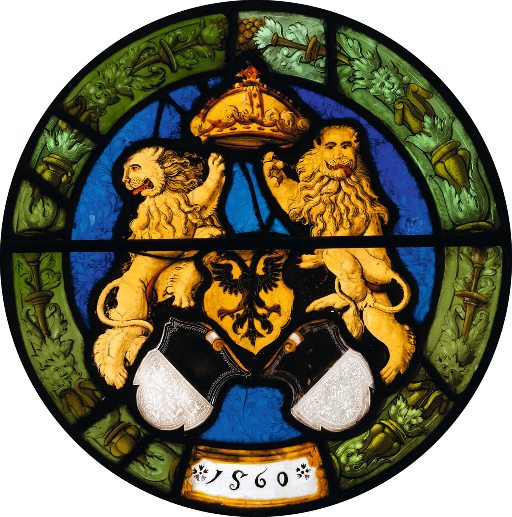Vor blauem Rankengrund halten zwei steigende Löwen die Reichskrone über die Freiburger Wappenpyramide. Die Hinterpranke auf die stark geneigten Freiburger Schilde setzend, schaut der rechte Löwe frontal aus dem Bild heraus, während der linke sein Haupt rückwärts wendet. Der rahmende grüne Blätterkranz ist mit Blattmasken durchsetzt und trägt am unteren Rand ein Täfelchen mit dem Datum der Stiftung.