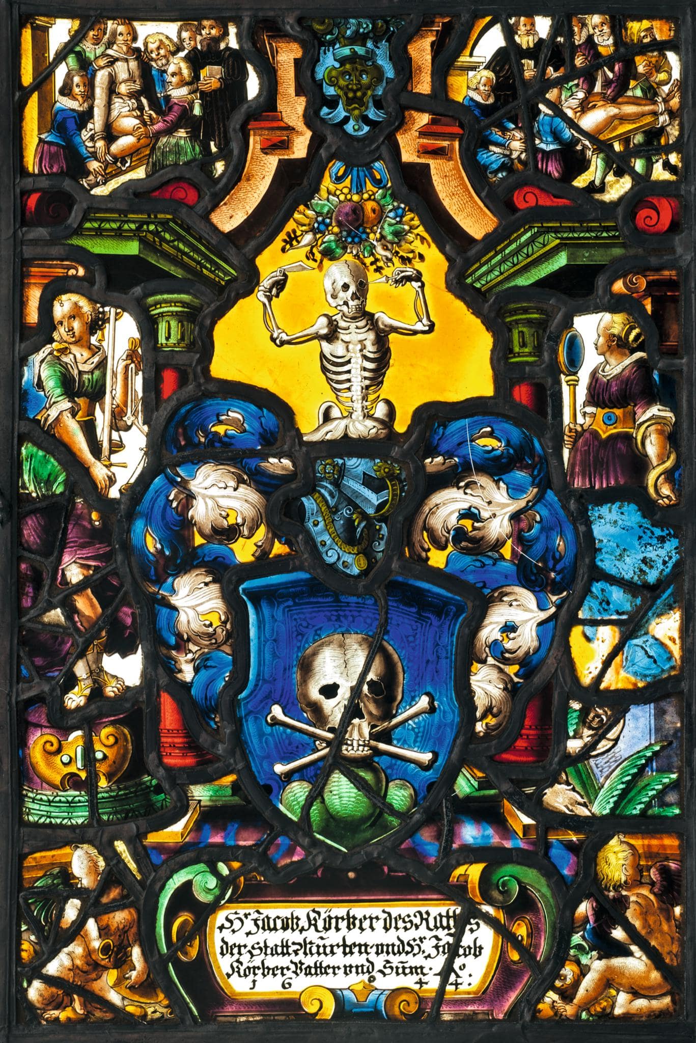 Das Wappen der Familie Körber wird von zwei weiblichen Allegorien in den seitlichen Architekturöffnungen flankiert. Links steht auf einem Podest Justitia (die Gerechtigkeit) mit Schwert und Waage, rechts Prudentia (die Klugheit) mit der Schlange und dem Spiegel als Sinnbild der Selbsterkenntnis. Neben dem Bogenaufsatz, von dem ein Fruchtbouquet vor gelbem Grund herabhängt, sind in den Oberbildern zwei Chirurgenszenen dargestellt, die auf den Beruf der beiden Stifter anspielen. Dargestellt sind der Steinschnitt, eine oft praktizierte Operation zur Entfernung von Blasen- und Nierensteinen, und die Bruchoperation. Links behandelt der Arzt den sitzenden Patienten. Den Unterkörper entblösst, hockt der Mann an Armen und Beinen zusammengebunden auf einer Trage und erwartet den Eingriff des Chirurgen, der zwischen seinen Beinen das Messer führt, um den Stein herauszuschneiden. Gehilfen halten den Patienten fest, denn die Narkose war noch unbekannt; ein Priester hält sich für den schlimmsten Fall mit der Bibel bereit, und ein Angehöriger schaut ängstlich über die Schultern der Anwesenden. Rechts liegt der im Schambereich entblösste Patient festgebunden auf dem Operationstisch. Der Arzt schickt sich an, mit dem Messser den Schnitt auszuführen, um den Bruch zu operieren. Dabei betrachtet er prüfend das Gesicht des Kranken. Gehilfen stützen den Kopf des Patienten und halten den vor Schmerz unruhigen Mann. Zugegen sind auch hier ein händeringender Angehöriger und ein Priester mit der Bibel. Seine Anwesenheit macht deutlich, dass stets mit einem Misslingen des Eingriffes gerechnet werden musste. Am Fuss der Scheibe rahmen zwei Putten mit Vasen und Früchten die rollwerkgerahmte Stifterinschrift.