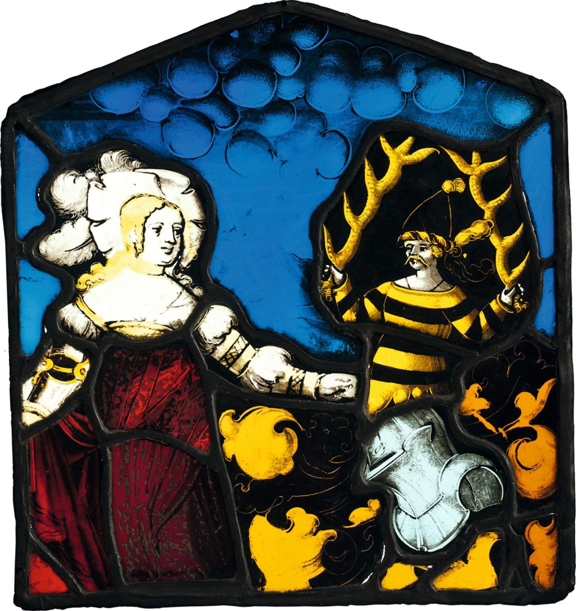 Das Fragment zeigt eine junge Frau vor einem bewölkten blauen Himmel als Schildhalterin eines Wappens, von dem nur noch die Helmzier erhalten ist. Die Dame trägt ein Renaissancekleid mit breitem Ausschnitt und langen gebauschten Ärmeln sowie ein keckes Federbarett auf dem blonden Lockenhaar.