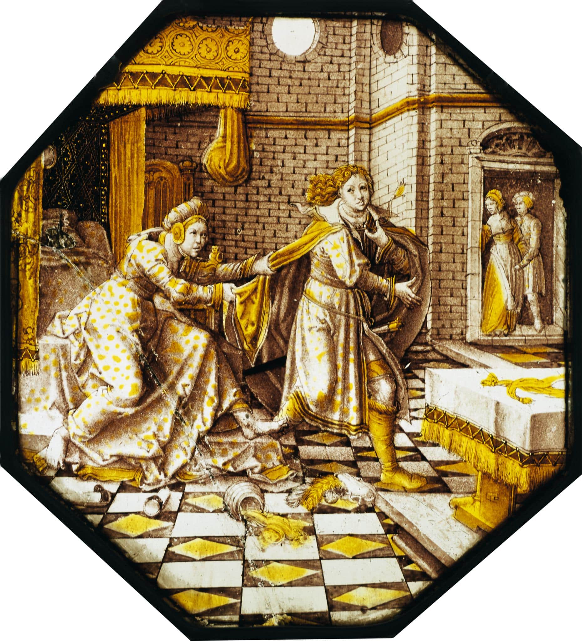 Bildscheibe um 1520: Joseph und Potiphars Weib · Scène de l’histoire de Joseph (Joseph fuyant devant la femme de Potiphar / Putiphar) (Genèse 39.1-20)