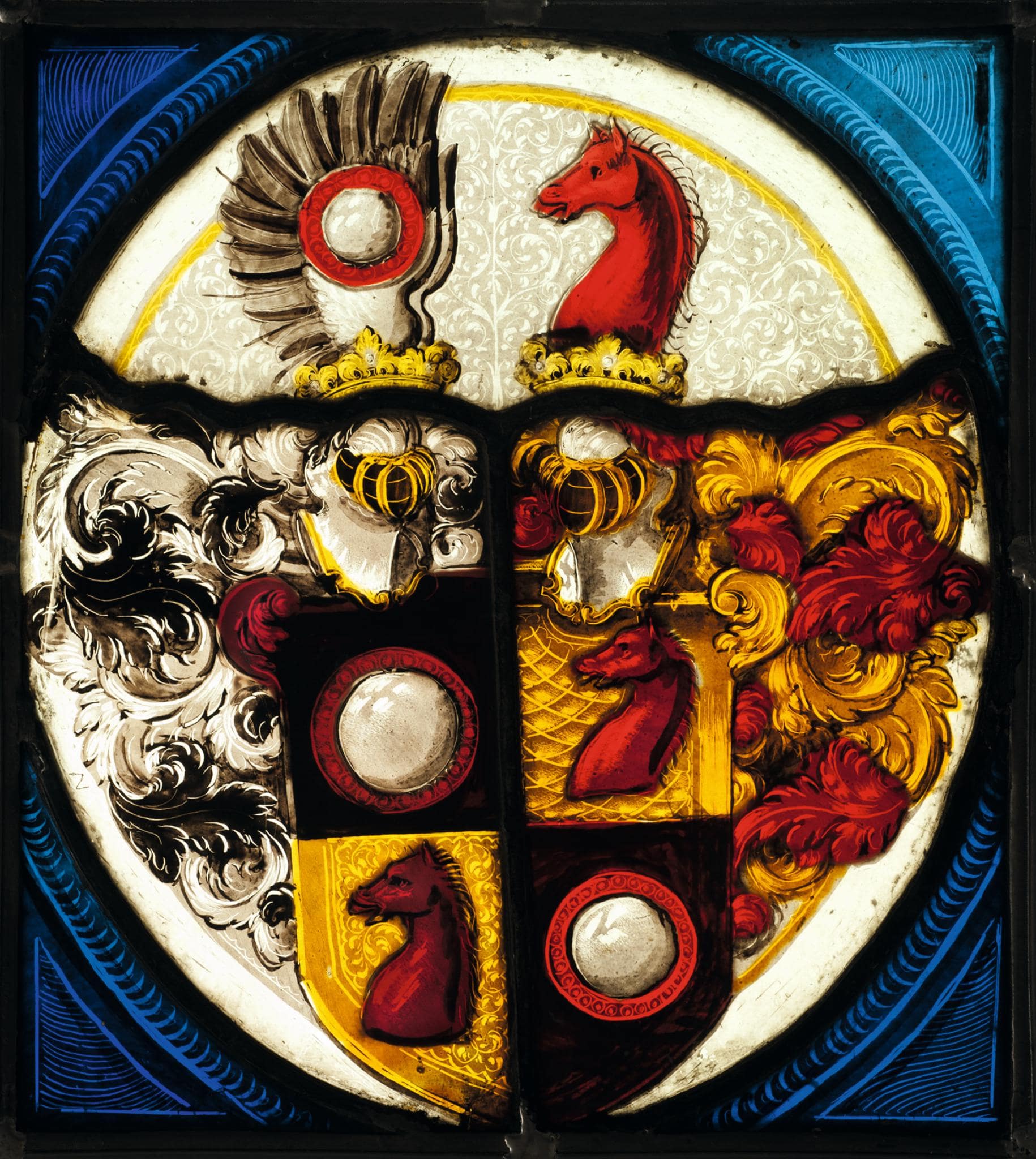 Das ursprüngliche Wappen mit dem einzelnen, rot gerahmten Spiegel wurde 1563 vermehrt und mit dem Pferderumpf, dem Wappenschild der ausgestorbenen Praun, geviert (Kaiser Ferdinand I. verlieh dieses Wappen am 9.12.1563 David von Lengheim, dem nächsten Blutsfreund Prauns, und Hans Stubich. S. Zahn/Siegenfeld 1893. S. 68. Ich danke Christina Wais in Wien für ihre freundliche Hilfe bei der Beschaffung des Steiermärkischen Wappenbuchs). Die Wappenscheibe ist sicher mit dem Grafen Adam von Lengheim († 1585) zu verbinden. Er erwarb 1578 die Burg Bertholdstein in Pertlstein (Sie blieb bis 1794 im Besitz der Familie, die 1835 im Mannesstamm ausstarb. Am Portal befindet sich der 1582 datierte Wappenstein Adam von Lengheims, der in Trautmannsdorf beigesetzt wurde, wo ein Spätrenaissance-Epitaph an ihn erinnert. Freundliche Hinweise von Barbara Giesicke, Badenweiler) von Policarp Stürgkh und 1583 die Burg Kapfenstein von Hans von Weisseneck. Adam war mit Helena von Weisseneck († 1584) verheiratet. Dem Ehepaar ist die folgende Wappenscheibe (VMR_166) zuzuweisen, welche im dritten und vierten Wappengeviert die Schildbilder der Weisseneck aufnimmt.