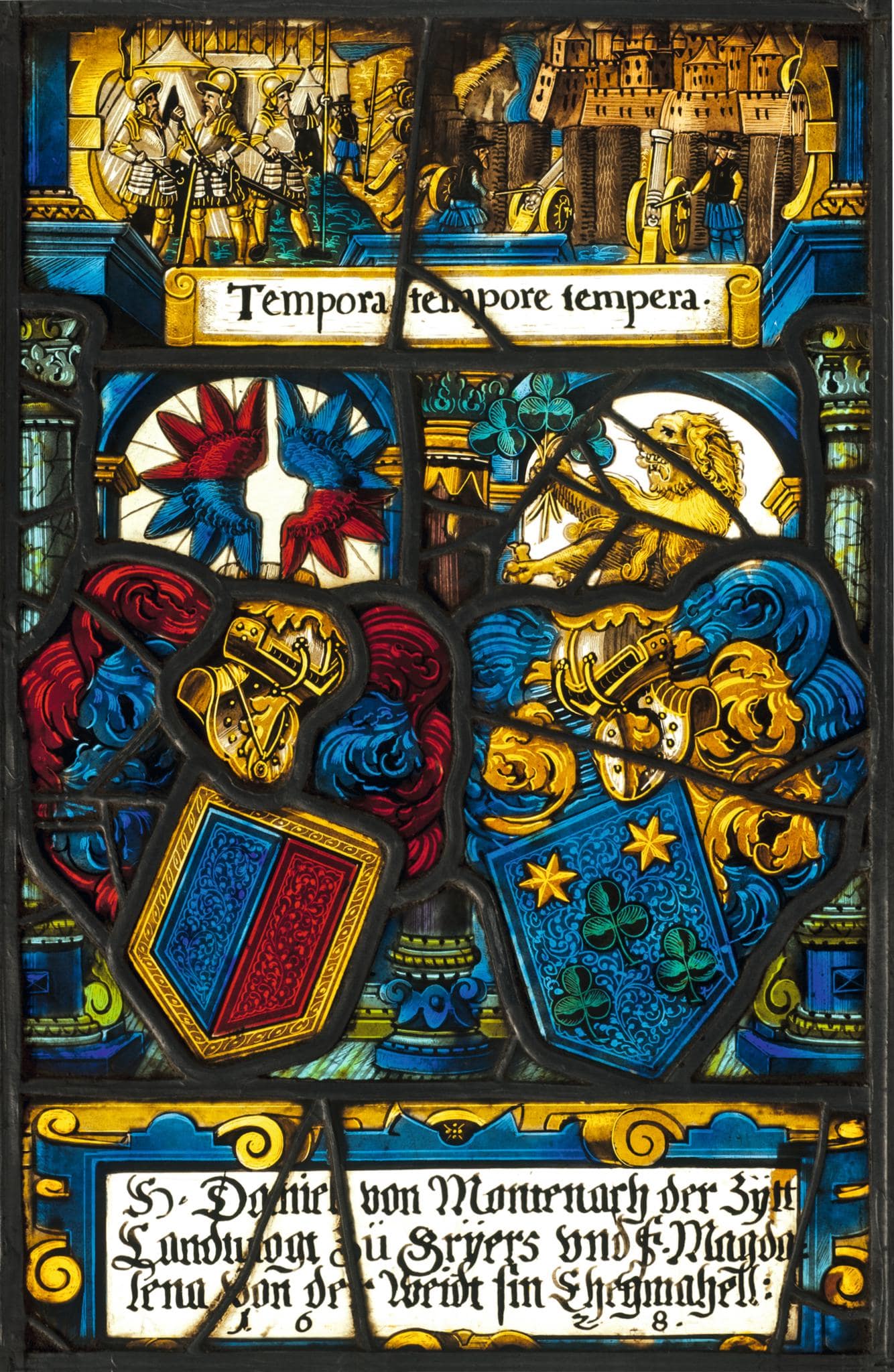 Stifterinschrift: H. Daniel von Montenach der Zÿtt / Landtuogt zü Grÿers vnd F. Magda: / lena von der Weidt sin Ehegmahell: / 1628.