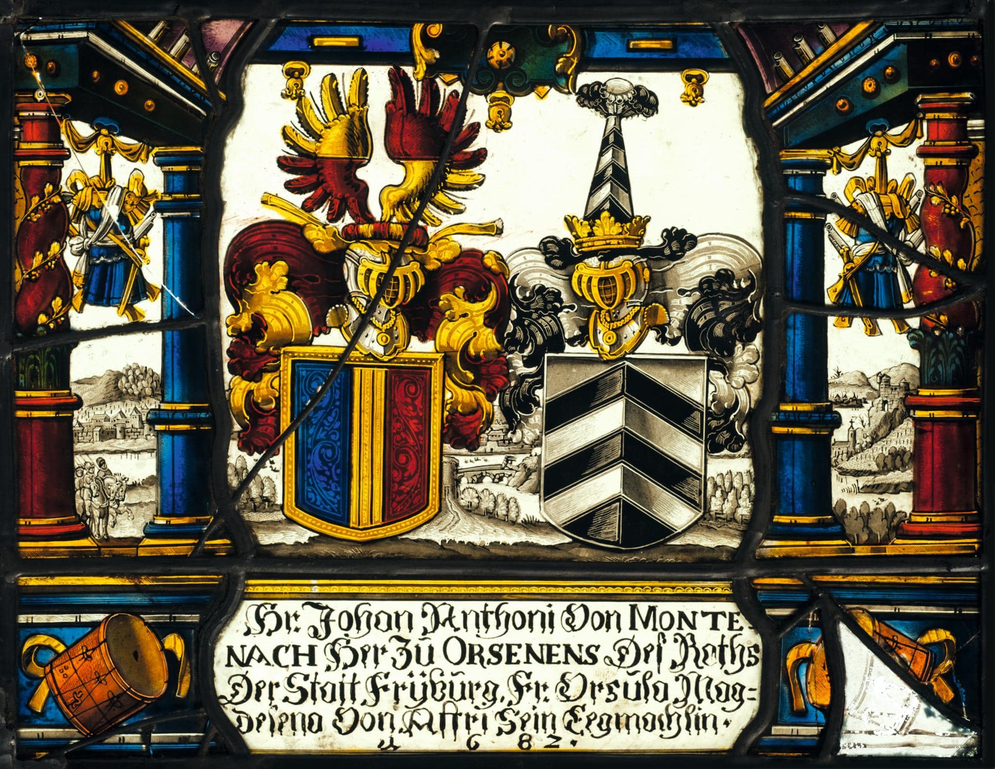 Stifterinschrift: Hr. Johan Anthoni Von MONTE- / NACH Her zu ORSENENS Des Raths / Der Statt Frÿburg, Fr. Vrsula Mag= / delena von Affri Sein Eegmachlin. / 1682.