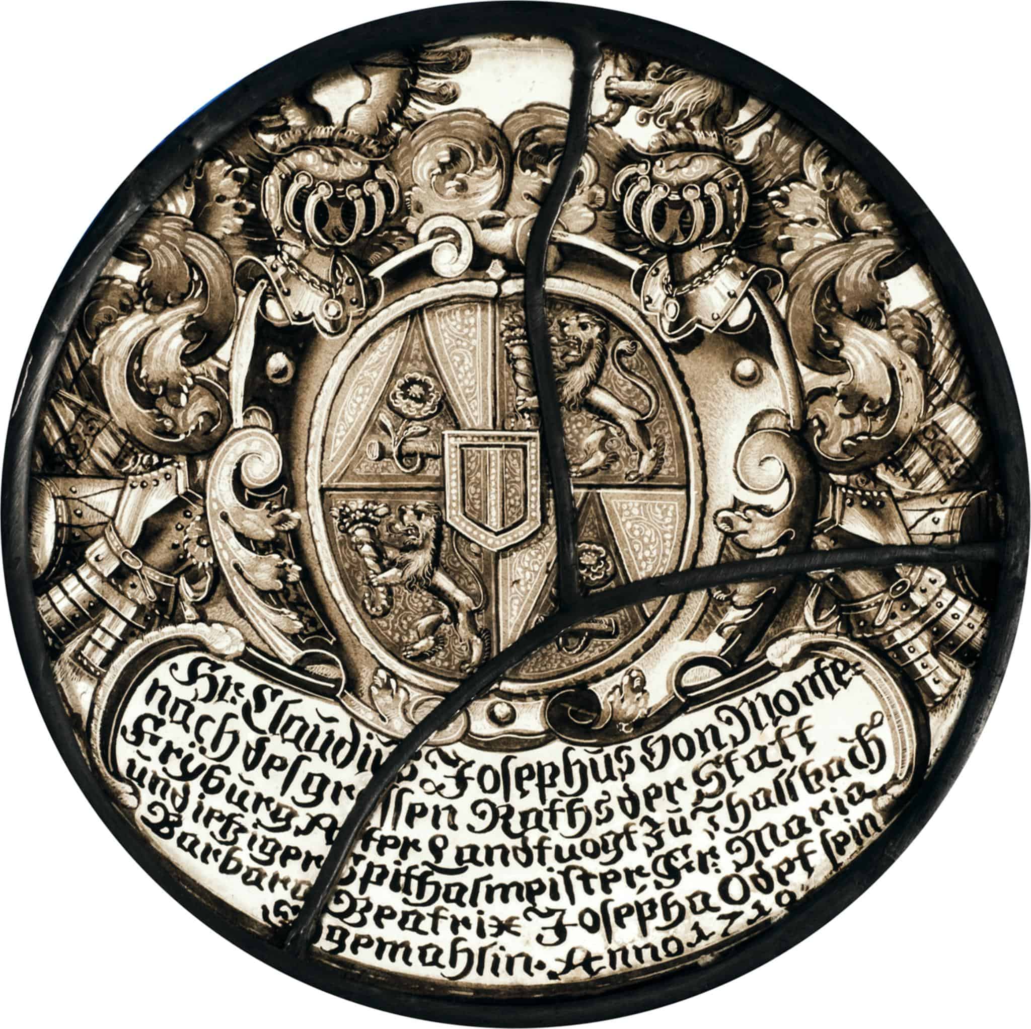 Stifterinschrift: Hr. Claudius Josephus von Monte= / nach des grossen Raths der Statt / Frÿburg Alter Landtuogt zu Tallbach / und ietziger Spithalmeister, Fr: Maria / Barbara Beatrix Josepha Odet sein / Ehgemahlin. Anno 1710.