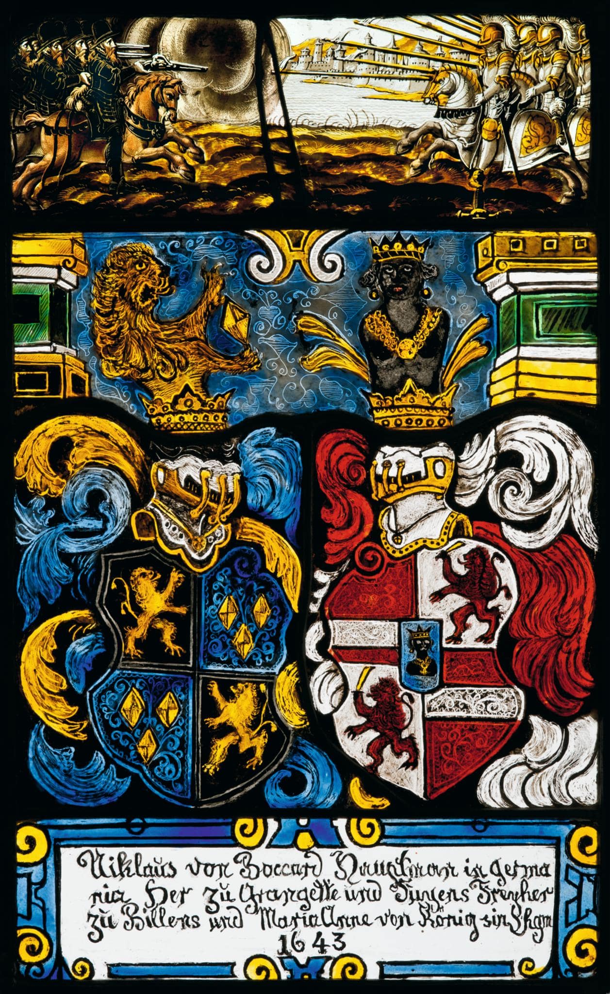 Stifterinschrift (ergänzt): Niklaus von Boccard Hauptman in Germa / nia Her zu Grangette und Fuyens Freyher / zu Billens und Maria Anne von König sin Ehgm / 1643.