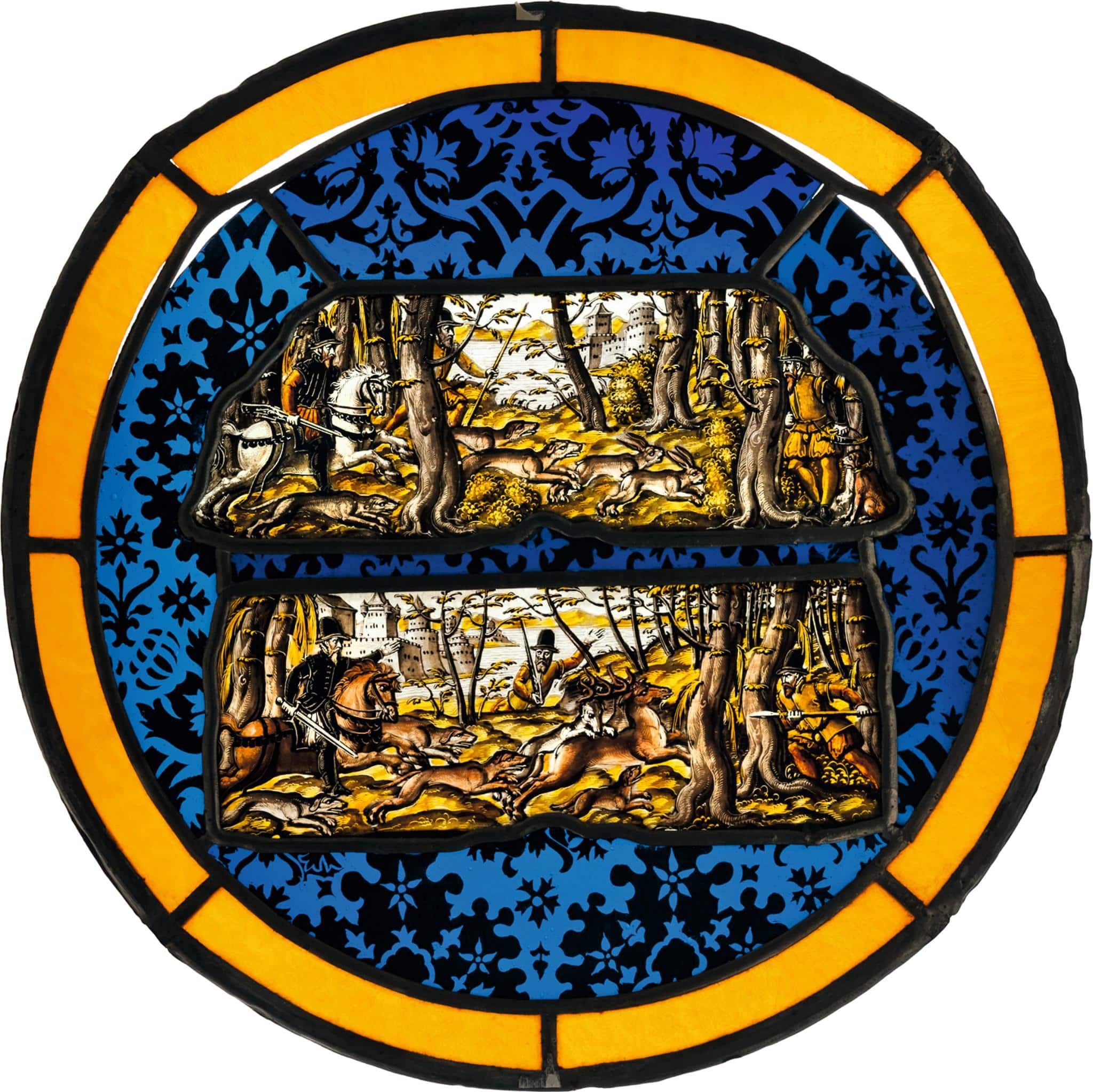 In eine moderne Rundscheibe mit blauem Damastgrund und orangefarbener Einfassung sind übereinander zwei ursprüngliche Oberbilder mit Jagdszenen eingepasst. Das obere zeigt eine Hasenhatz im Wald. Auf einem Schimmel folgt der Jäger mit der Flinte seinen Hunden, die zwei Hasen auf einen hinter Bäumen versteckten Mann zutreiben. Zu Füssen des ruhig zuschauenden Jägers sitzt abwartend sein Hund. Durch die Waldlichtung geht der Blick auf eine am Seeufer liegende Burg.