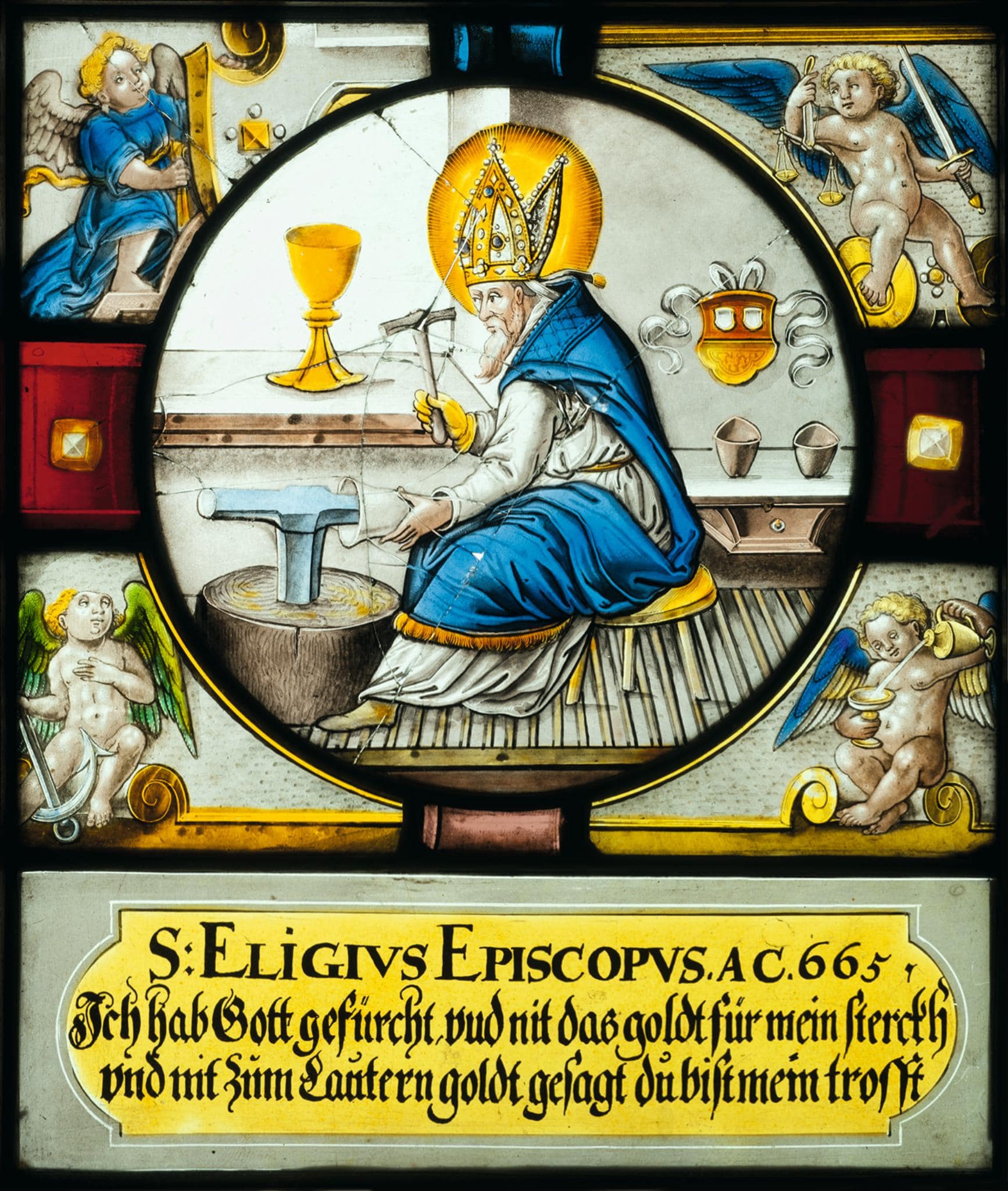 Der hl. Eligius (* um 590) erlernte das Goldschmiedehandwerk und arbeitete zunächst am Hof des Merowingerkönigs Chlotar (584–622), den er jedoch verliess, um 639–641 Bischof von Tours zu werden. Er beschenkte Arme und liess Klöster bauen. Eine seiner mit Vorliebe in der Kunst dargestellten Wundertaten machte ihn zum Patron der Schmiede: einem störrischen Pferd, dessen Huf er beschlagen sollte, schnitt er kurzerhand das Bein ab, befestigte das Hufeisen und setzte das Bein wieder an.