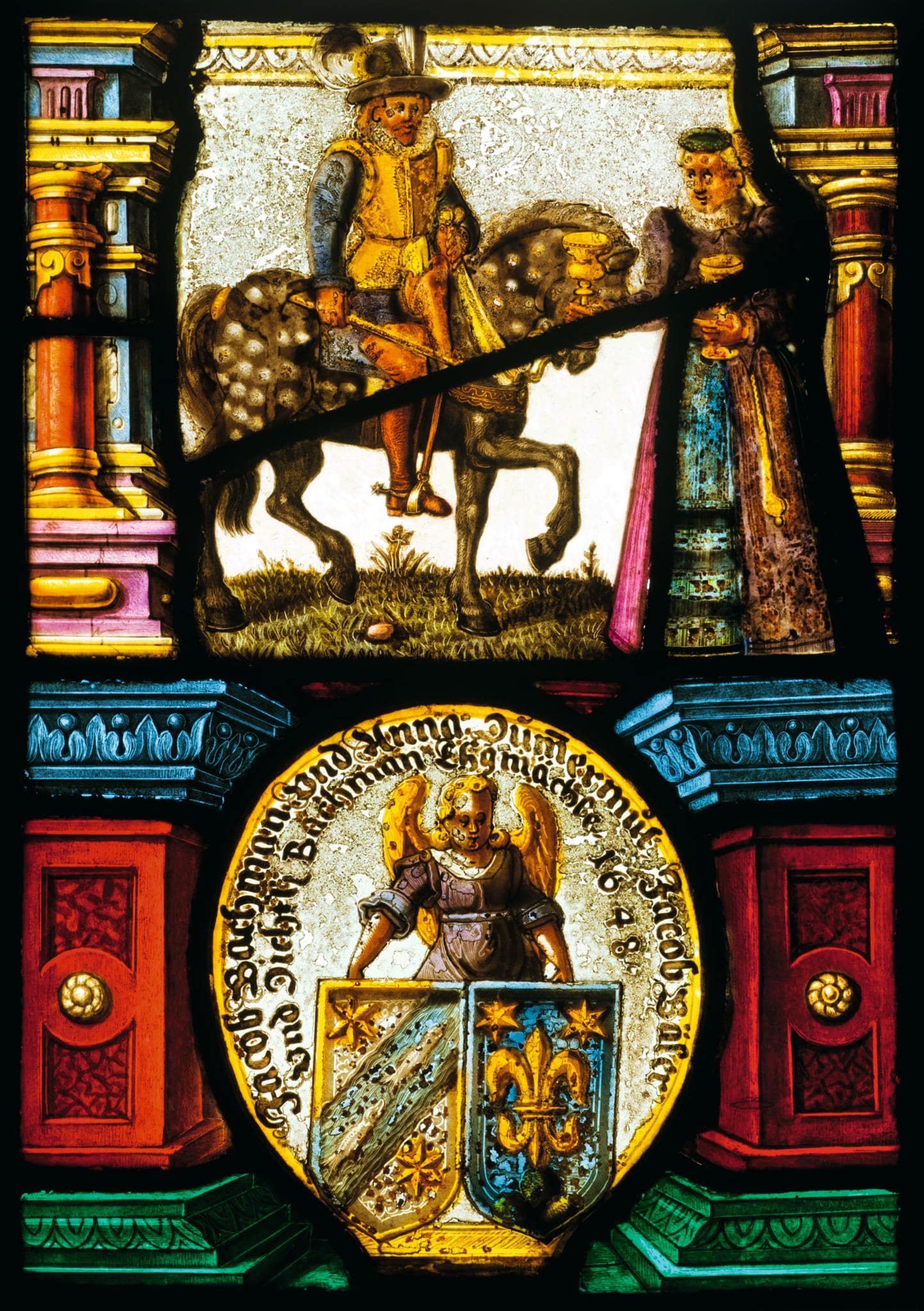 In der oberen Hälfte der stark ergänzten Scheibe ist der Stifter zu Pferd dargestellt. Schmuck gekleidet, ein gelbes Wams mit Halskrause und stolz einen Federhut tragend, sitzt der Reiter in hohen Lederstiefeln auf seinem gescheckten Pferd, das auch mit goldenem Schweifring und Zaumzeug herausgeputzt ist. Seine Frau begegnet ihm in der Sonntagstracht und trägt auf dem hochgesteckten Haar ein Barett. Sie hält in beiden Händen einen goldenen Becher zum Willkommenstrunk bereit. Pilaster mit vorgestellten Säulen rahmen die Bildszene. Die untere Scheibenhälfte nimmt eine ovale Kartusche zwischen zwei Pilastern ein. Ein Engel präsentiert die beiden dicht nebeneinanderstehenden Wappen der Stifter, die sich in der randständigen Inschrift als zwei verwandte Ehepaare zu erkennen geben.