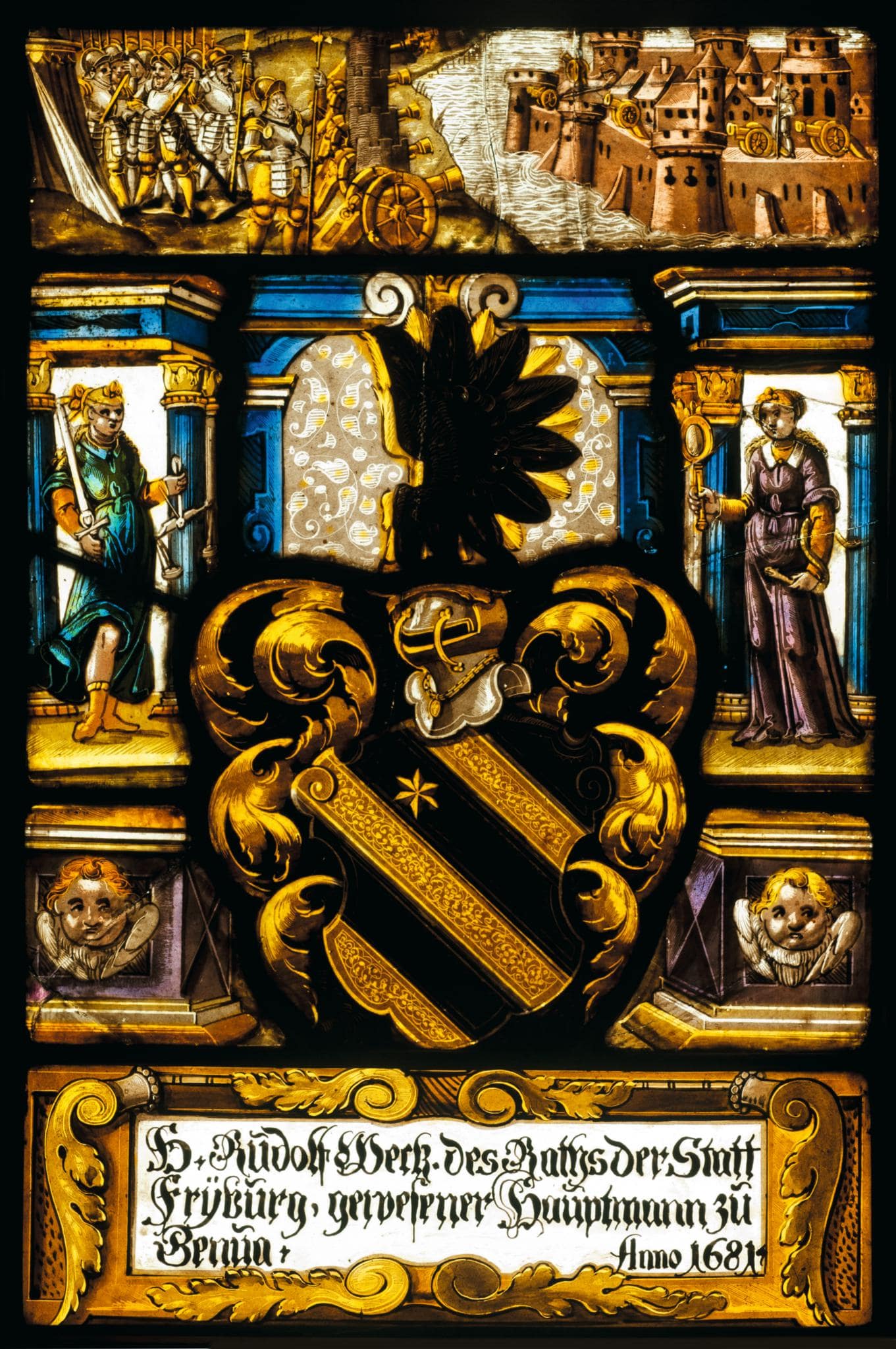 Stifterinschrift (ergänzt): H. Rudolf Weck. des Raths der Statt / Frÿburg, gewesener Hauptmann zu / Genua. Anno 1681.